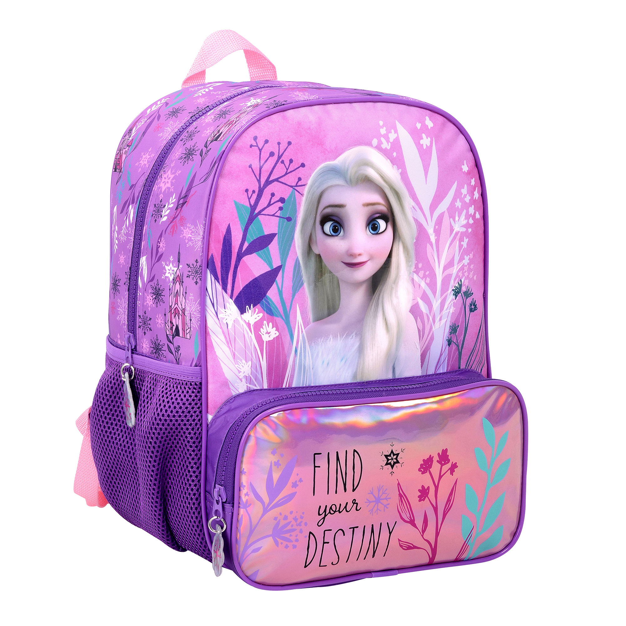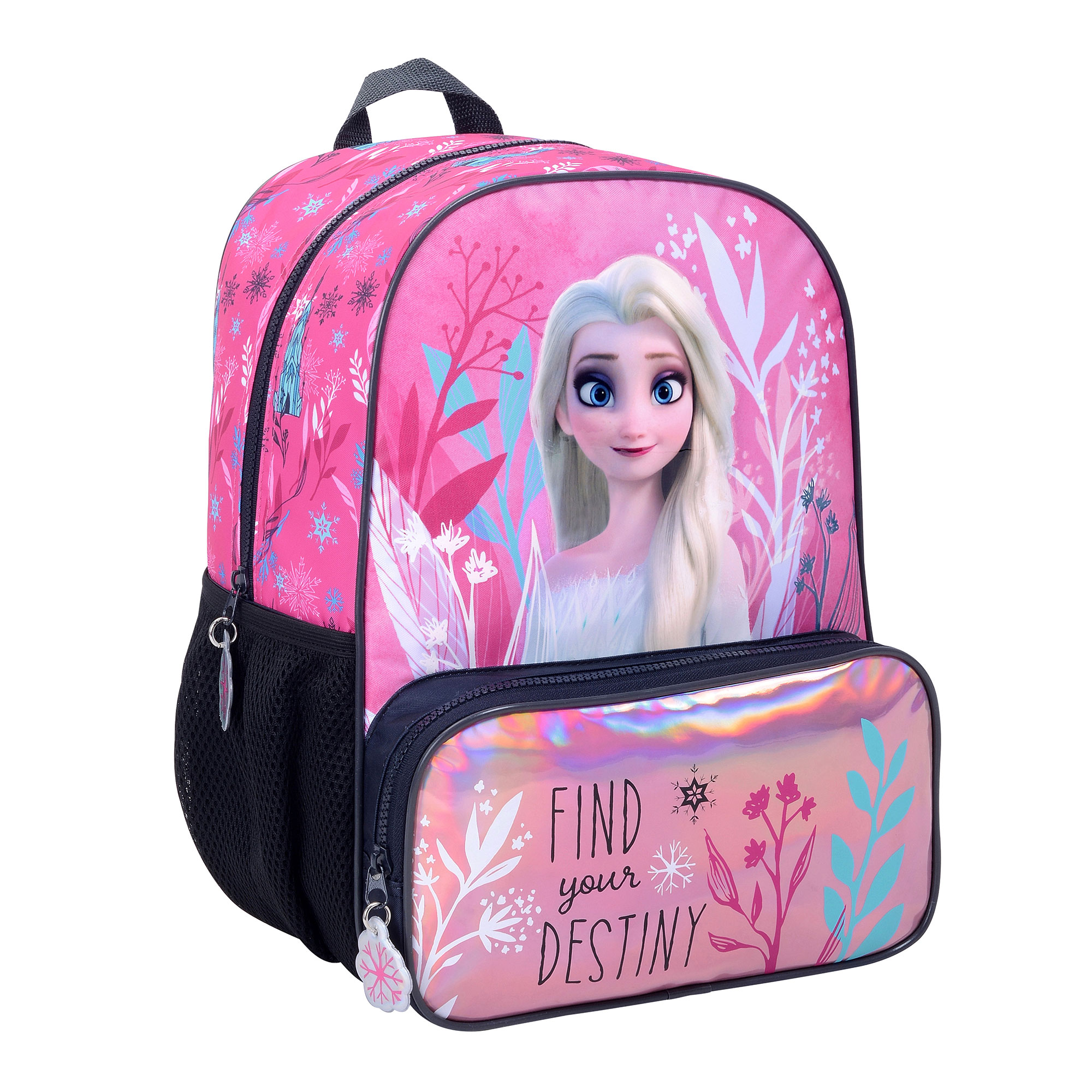 Mochila infantil de frozen en tono rosa con compartimento principal con el espacio justo para llevar los útiles escolares o ir a pile. Tiene tiras regulables, bolsillos de red en los laterales y un bolsillo amplio holográfico simil cartuchera para llevar más útiles. Estampa en relieve de la princesa frozen.