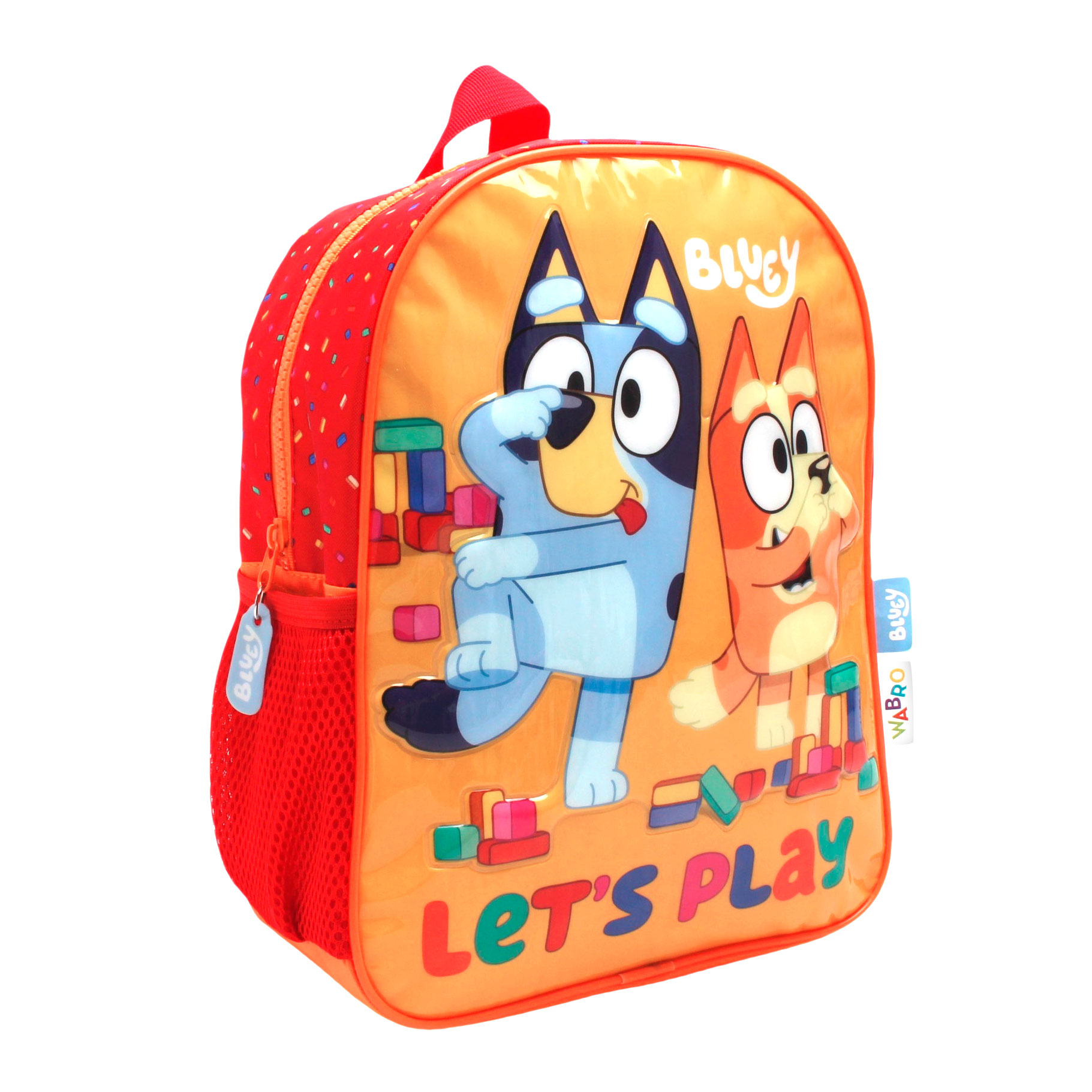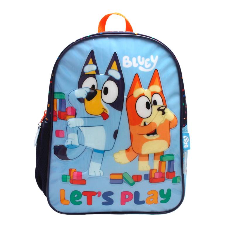 Mochila infantil de bluey color azul. Compartimento principal con el espacio justo para llevar los útiles escolares o ir a pile. Tiene tiras regulables, bolsillos de red en los laterales y un bolsillo amplio. Estampa en relieve de tus personajes favoritos que te invitan a jugar.