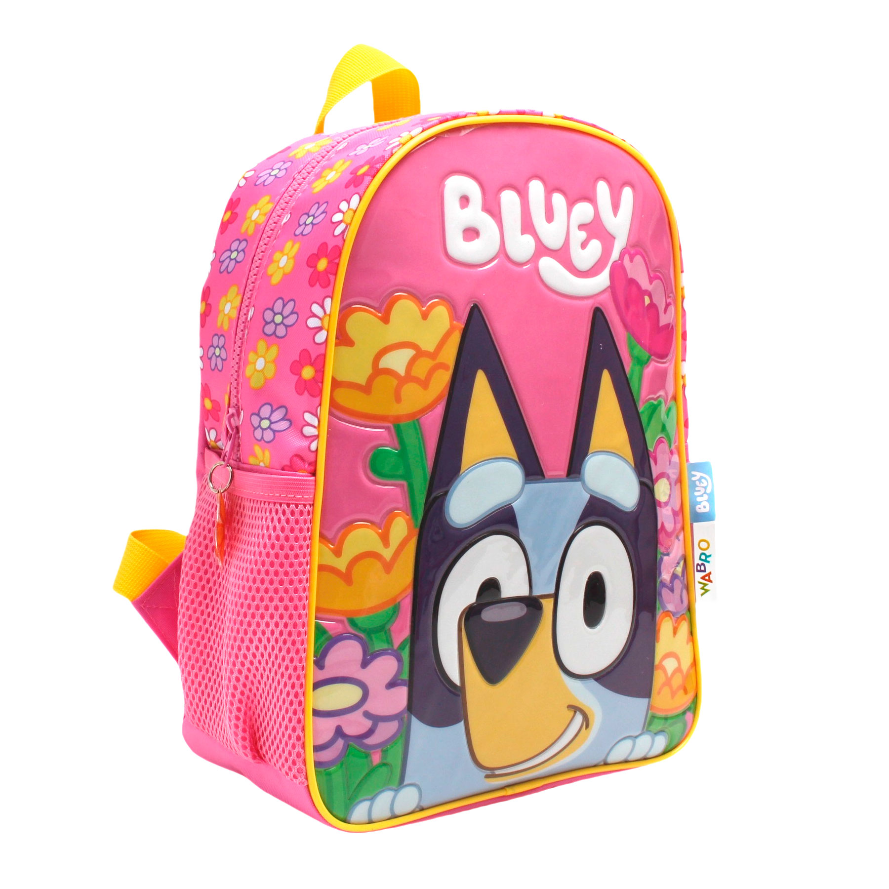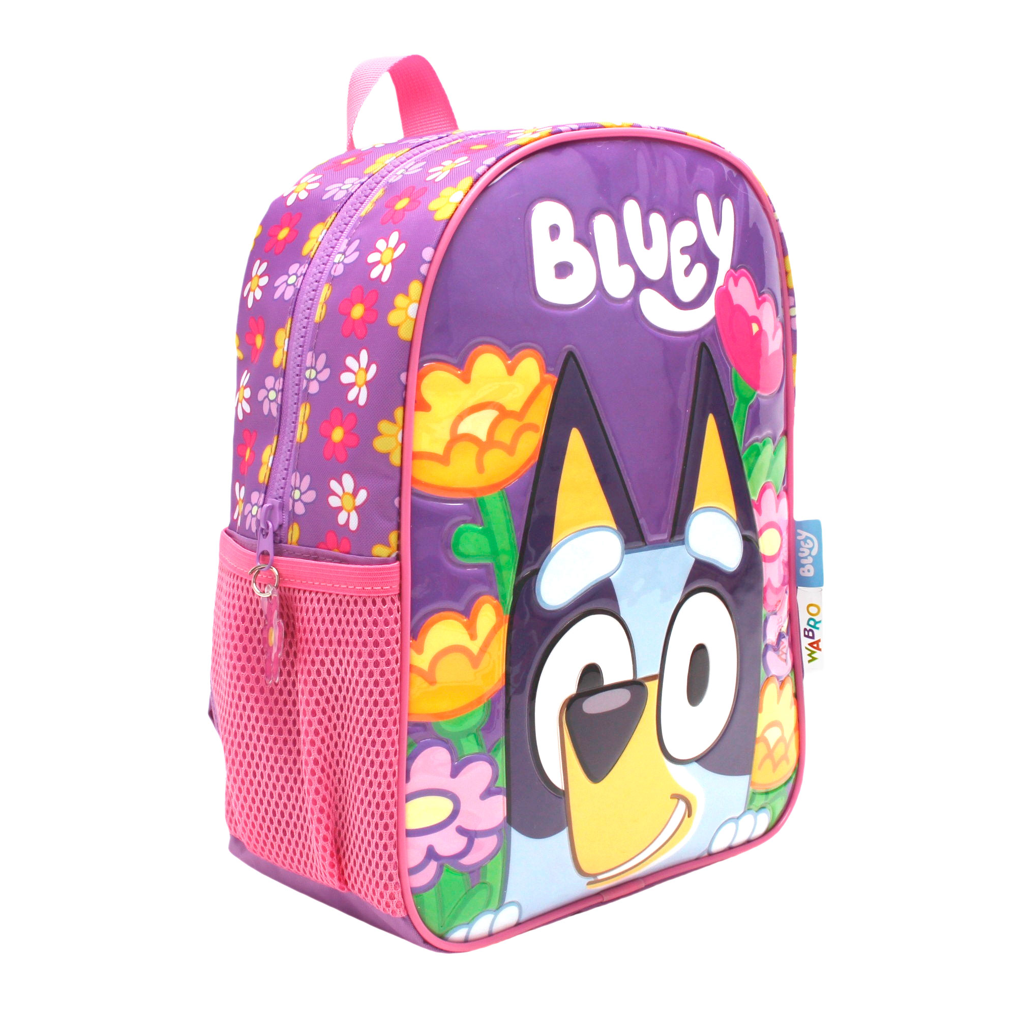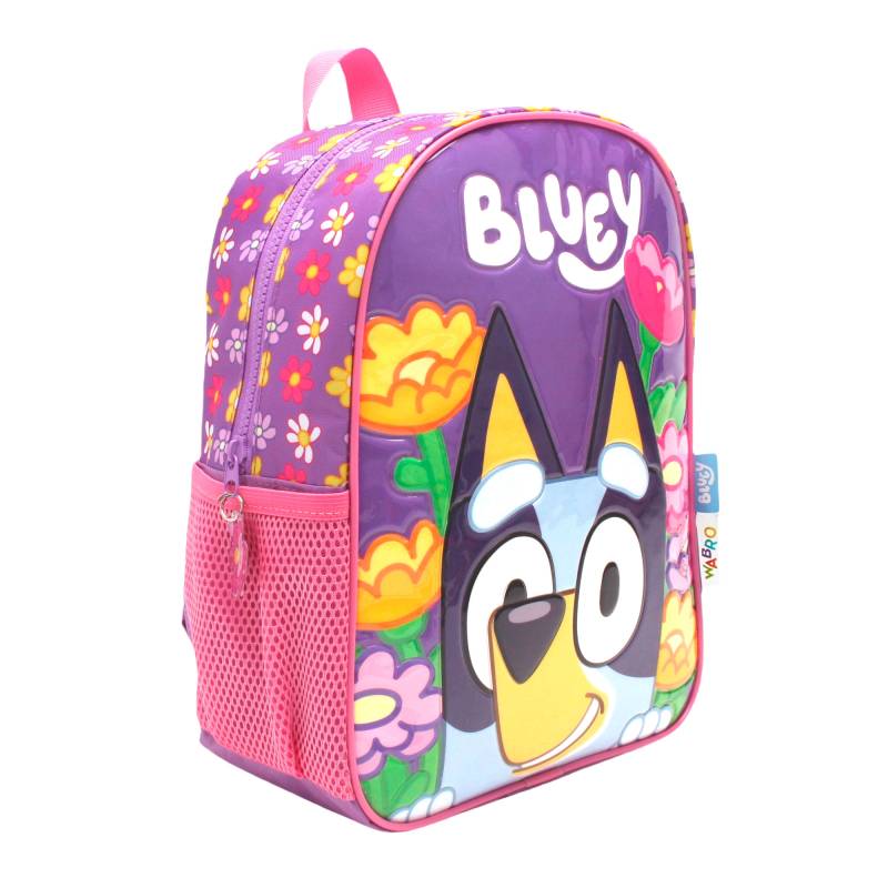 Mochila de bluey color violeta con detalle de flores. Compartimento principal con el espacio justo para llevar los útiles escolares o ir a pile. Tiene tiras regulables, bolsillos de red en los laterales y un bolsillo amplio. Estampa en relieve de bluey.