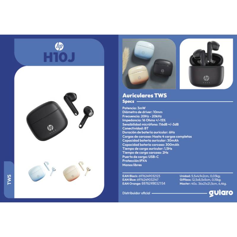 Auriculares BT HP H10J Azul En la calle, en el colectivo o en la oficina, tené siempre a mano tus auriculares HP y ¡Escapate de la rutina por un rato! Vas a poder disfrutar de la música que más te gusta y de tus podcasts favoritos cuando quieras y donde quieras. Al ser in-ear, mejoran la calidad del audio y son de tamaño pequeño para poder insertarse en tu oreja. Son ideales para acompañarte a la hora de hacer ejercicio mientras te sumergís en el mejor sonido envolvente.