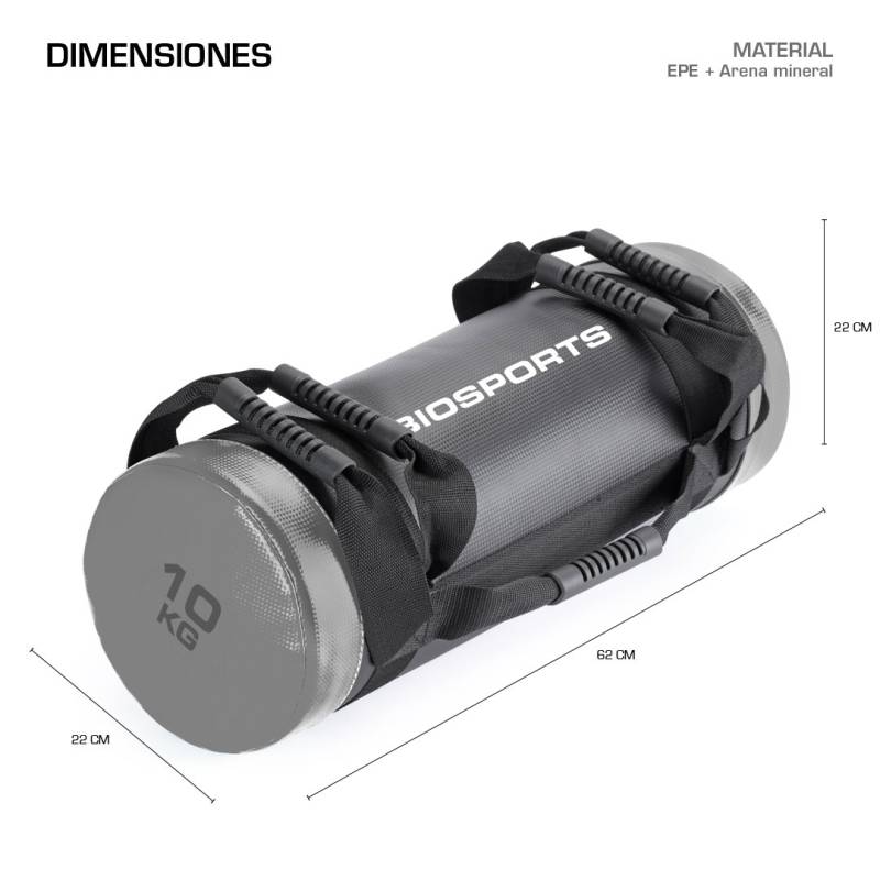 Core Bag 10 Kg Biosports Características Principales: - Material de Alta Resistencia: Confeccionada en lona de alta resistencia, esta core bag está diseñada para durar, soportando el impacto de tus entrenamientos más intensivos. La doble costura reforzada garantiza una durabilidad superior. - Diseño para el Impacto: Diseñada para soportar el impacto, esta core bag es ideal para ejercicios que requieren lanzamientos, giros y movimientos de alta energía, asegurando que mantenga su forma y funcionalidad. - Múltiples Agarres: Equipada con cinco agarres reforzados, esta core bag te ofrece una gran variedad de opciones de sujeción. Los agarres están estratégicamente colocados para permitir una amplia gama de ejercicios, proporcionando versatilidad y comodidad. - Dimensiones del Producto: Con un largo de 62 cm y un diámetro de 22 cm, la core bag está diseñada para ser manejable y práctica, permitiéndote realizar movimientos fluidos y controlados.