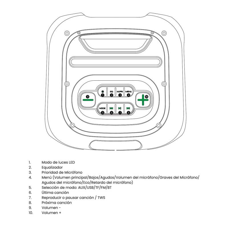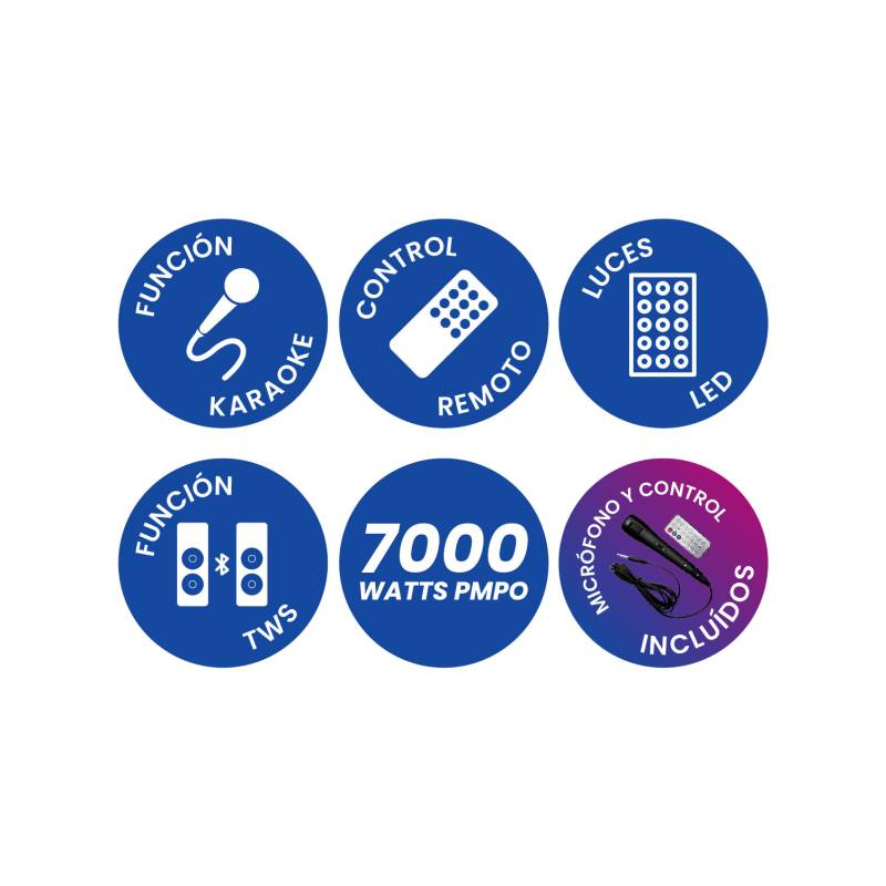 Sistema Multimedia de Audio que ofrece un sonido potente y envolvente en la reproducción de contenidos multimedia. Presenta un diseño de ultima generacion con materiales de excelente calidad. Conexión bluetooth, batería de larga duración, frecuencia de radio FM, conector USB/TF/FM/BT/TWS/Entrada auxiliar/Entrada de micrófono, incluye micrófono ideal para hacer KARAOKE, posee control remoto, pantalla de visualización LED, tarjeta de memoria, menu superior de goma (agudos, graves, mic vol, echo, vol). Potencia de 7000 watt y luces ritmicas que acompañan el sonido en todo momento.. Tecnologia TWS que permite conectar en simultaneo dos equipos