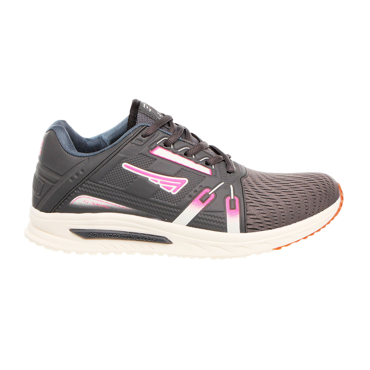 Zapatilla deportiva de mujer color gris con detalles en rosa, suela en color blanco. Ultraliviana para disfrutar tus momentos de recreación.