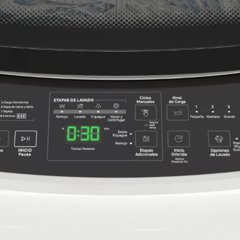 Con una capacidad bruta de 9 kg, este lavarropas es perfecto para familias medianas o grandes, permitiendo lavar grandes volúmenes de ropa, incluyendo prendas voluminosas como edredones y toallas. Su tipo de carga superior facilita el acceso al tambor sin necesidad de agacharse, mientras que la puerta de vidrio/plástico resistente ofrece una visual del interior sin comprometer la durabilidad ni la estética del equipo.