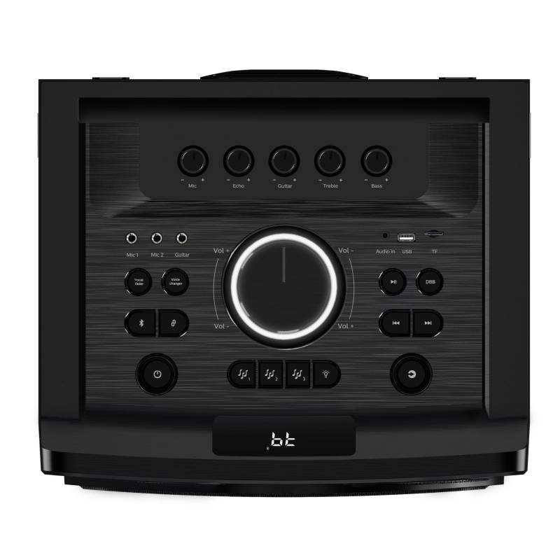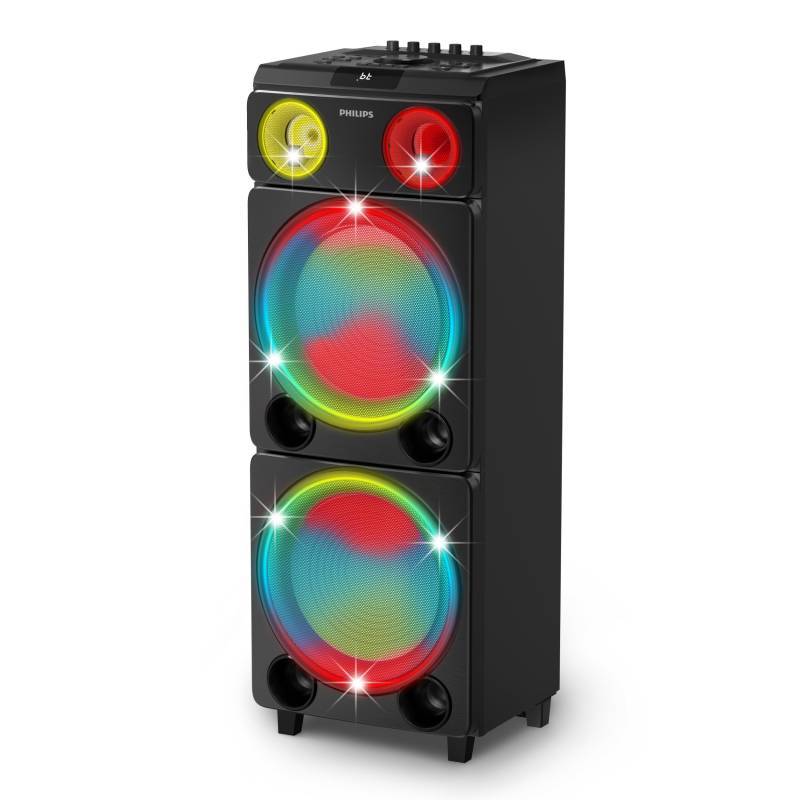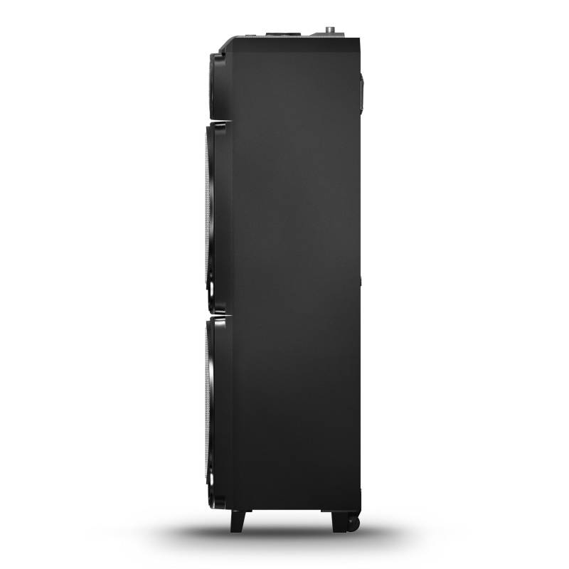 Party Speaker Bluetooth I Potencia de 260W RMS | 2 x Woofer 12" | Alcance Bluetooth: 10 metros| Consola superior para regular volumen, ecualizador y luces | Entrada para micrófono y guitarra | Función karaoke | Radio FM | Luces rítmicas | Control remoto incluido.