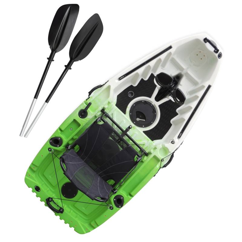 Kayak de pesca pequeño de 2 m de longitud con propulsión a pedal, muy cómodo y fácil de transportar.