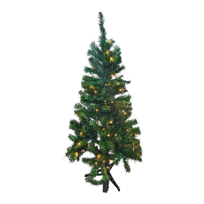 Árbol de Navidad 120 cm: 230 puntas · hoja 6 cm · espesor 0,07 cm · base plástica · 100 luces LED · funciona con 3 pilas AA (no incluidas)