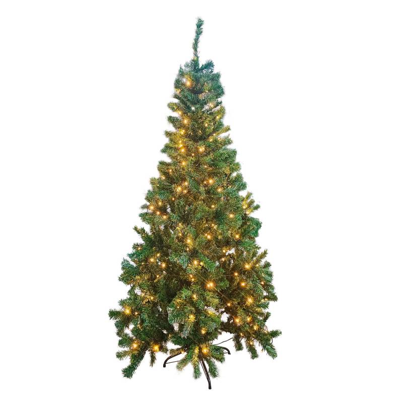Árbol de Navidad 180 cm: 760 puntas · hoja 6 cm · espesor 0,07 cm · base metálica · 300 luces LED · corriente directa con adaptador
