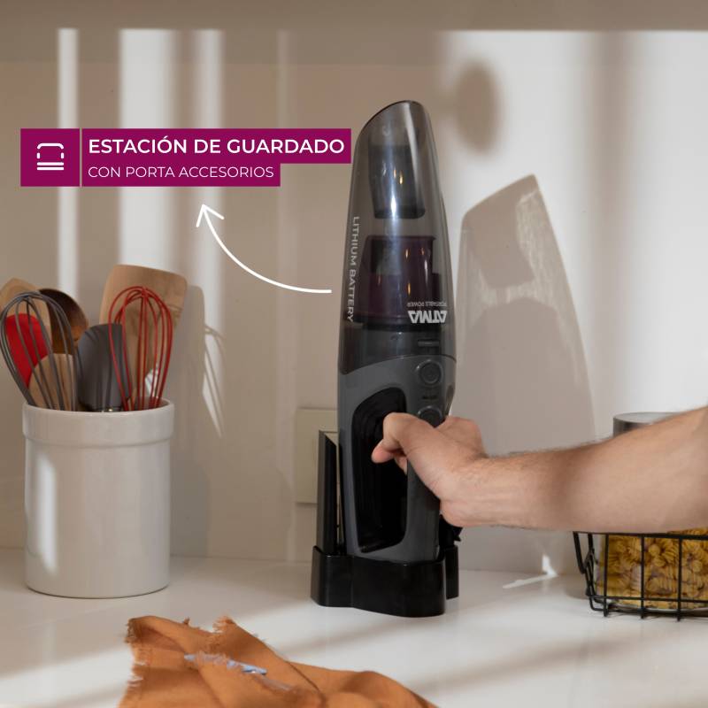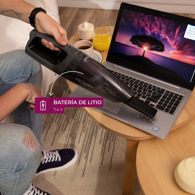 Aspiradora De Mano Inalámbrica -Aspira Polvo Y Líquidos -Pet Friendly: Recoge Pelo De Mascotas -Bateria De Litio 7.4V -Autonomía De Uso 20 Min -Carga Completa En 4-5 Horas -Depósito De Secos 400 Ml -Depósito De Líquidos 150Ml -Filtro De Tela Lavable Reutilizable -Boquilla Para Zonas Estrechas -Boquilla Para Líquidos -Soporte Para Aspiradora Y Accesorios -Fácil Limpieza