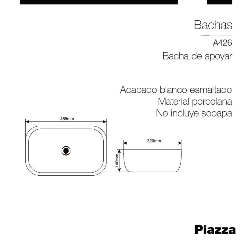 Bacha Apoyo Rectangular A426 Piazza Lavatorio Pileta Baño (A426) Innovación en griferías de alta calidad, diseño y tecnología No incluye Sopapa