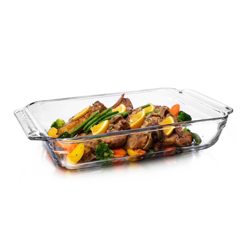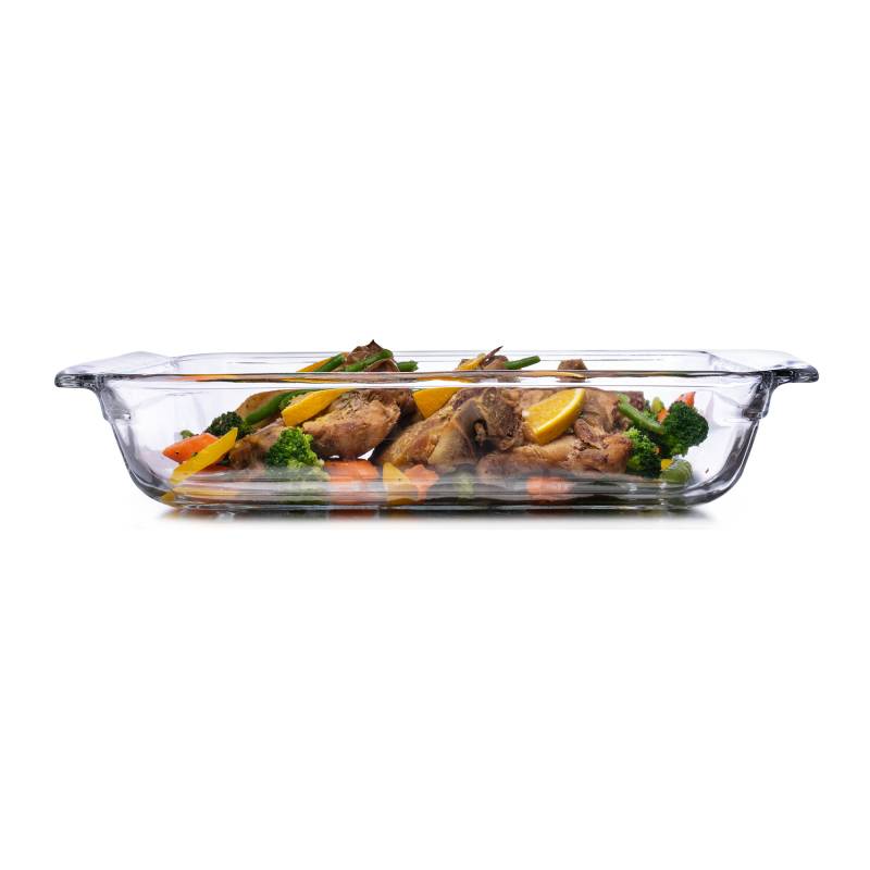 Asadera rectangular de vidrio "Baker´s Premium" con capacidad de 4 litros. Ideal y práctica para resolver de una sola vez la cocción de sus comidas y la conservación de estas ya listas para presentar en su mesa. Se destaca el diseño de sus asas para un mejor agarre.