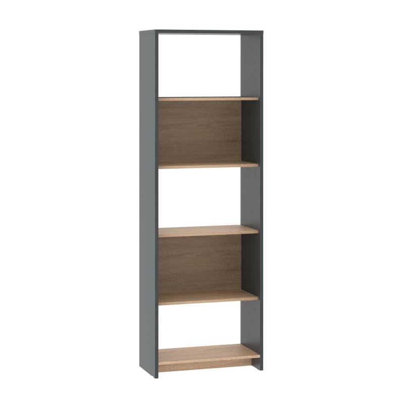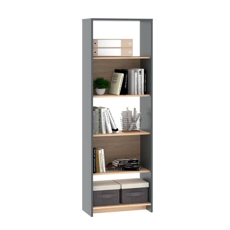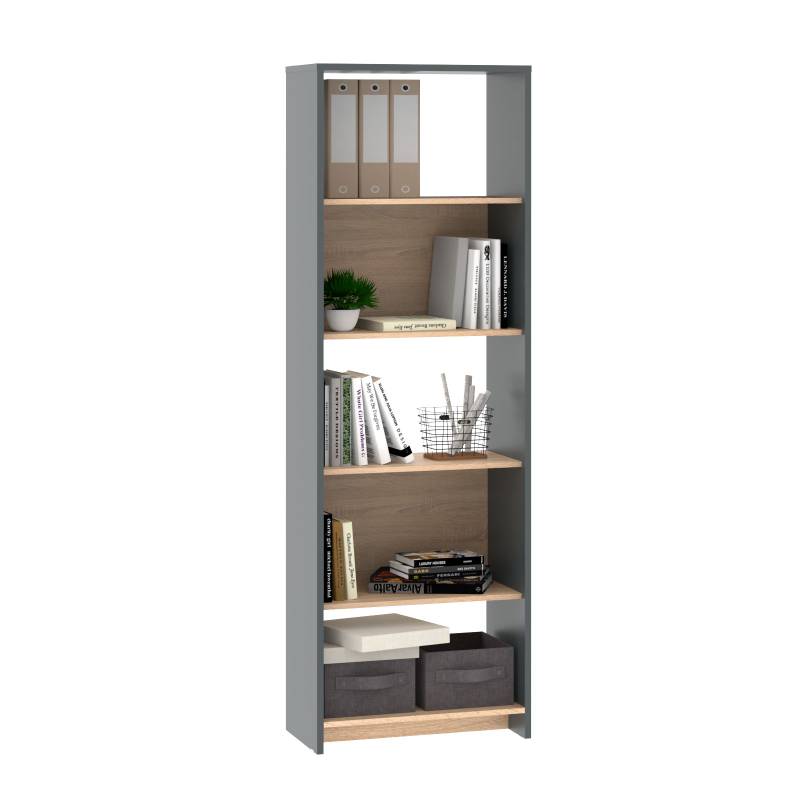 Biblioteca Dielfe Gris y Marrón BEN060 La biblioteca de la línea Niza es una amalgama perfecta de funcionalidad y estilo. Ofrece un generoso espacio de almacenamiento distribuido en cinco estantes, de los cuales dos están diseñados específicamente para libros, incorporando fondos que evitan que estos se caigan. Los restantes estantes se presentan como opciones ideales para almacenar diversos objetos y también para fines decorativos. Este mueble está diseñado con una unidad de melamina de 15mm encajada en una estructura en forma de "U" de melamina de 18mm.