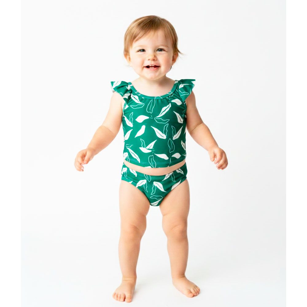 Conjunto de baño infantil de dos piezas, ideal para disfrutar del verano con total comodidad. Confeccionado en tejido suave, elástico y de secado rápido que se adapta al movimiento. La parte superior con volados aporta un detalle delicado y moderno. Su estampa fresca y colorida lo convierte en una opción práctica y encantadora para playa o pileta.