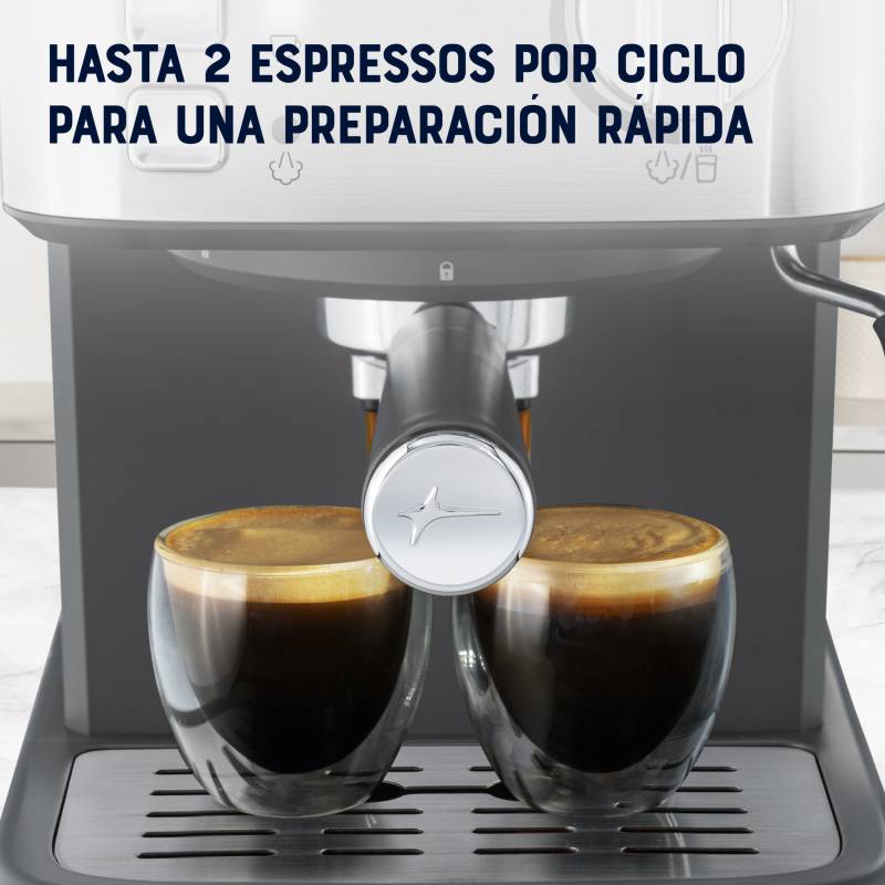 Tiene una bomba italiana de 12 bar de presión para preparar un deliciosos espresso y puede preparar hasta dos espressos por ciclo. Posee un tanque de agua de 1.5L extraíble que permite llenarlo fácilmente y una fácil limpieza, además incluye porta filtros para café molido de 1 y 2 tazas y una cuchara medidora/aplanador de café.