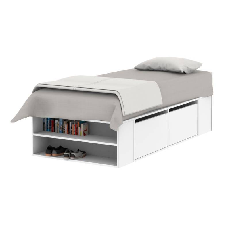 Cama 1 Plaza 93x192 Dielfe Aprovecha al máximo tu espacio con esta cama de 1 plaza diseñada para combinar funcionalidad y estilo. Perfecta para quienes buscan optimizar el almacenamiento gracias a sus dos amplios módulos de cajones integrados debajo de la cama, ideales para guardar ropa de cama, juguetes, libros, zapatos o cualquier objeto que necesites tener a mano pero fuera de la vista. Además cuenta con un estante en el pie de cama pensado para ofrecerte un espacio extra de almacenamiento y organización. Su color Blanco liso es ideal para crear un ambiente luminoso y minimalista, que se adapta a cualquier estilo de decoración. Esta cama de 1 plaza no solo destaca por su funcionalidad, sino también por su diseño versátil, que permite armarla de manera espejada según tus necesidades y la distribución de tu espacio. Cuenta con la posibilidad de elegir en qué lado queres que se encuentren los cajones. Esto significa que, al momento del armado, podes colocar los cajones a la derecha o a la izquierda de la cama, dependiendo de lo que mejor se ajuste a tu habitación. Podes colocar un colchón de hasta 90 cm de ancho.