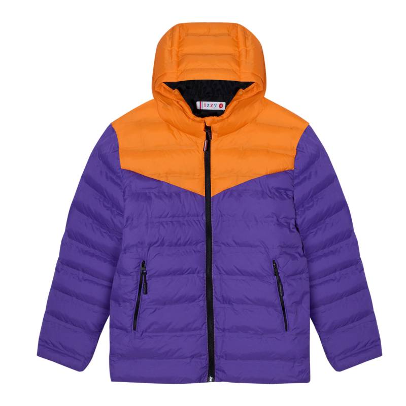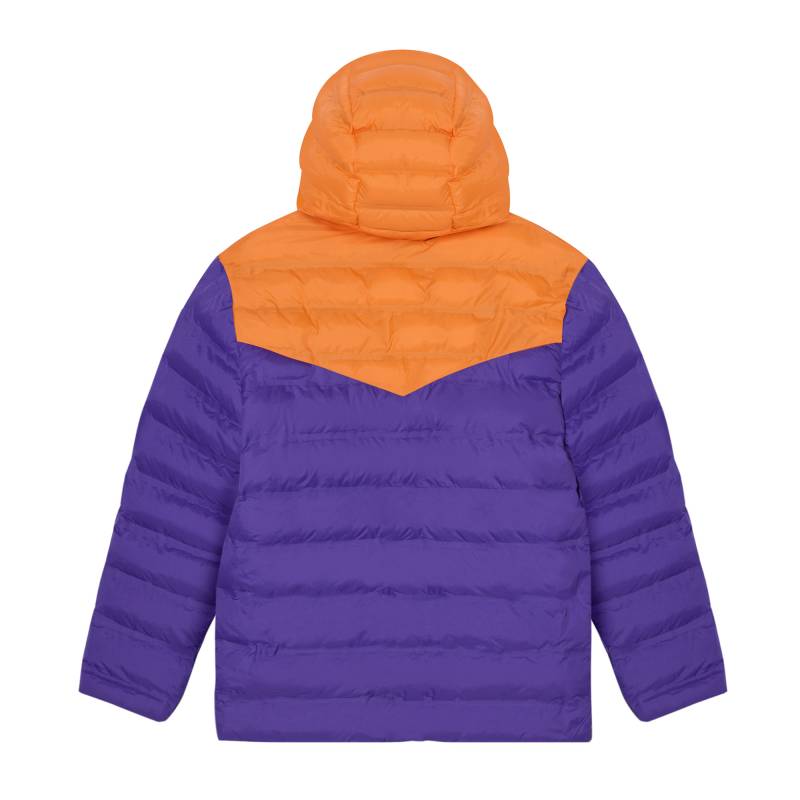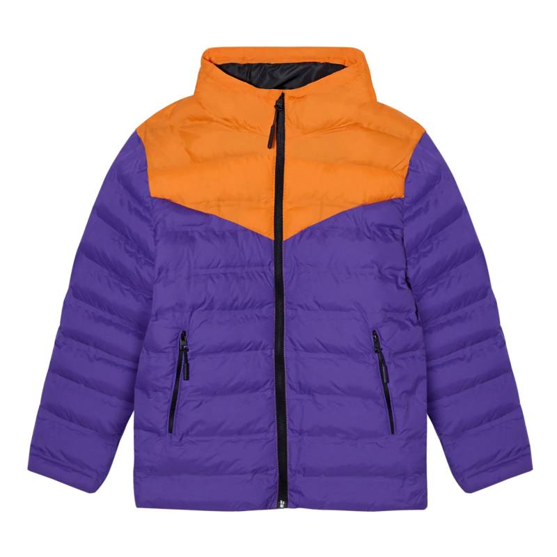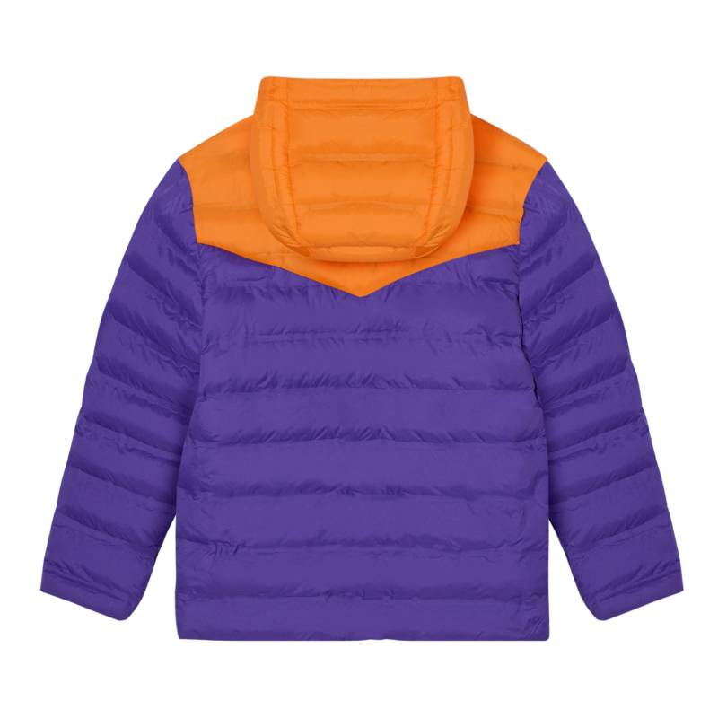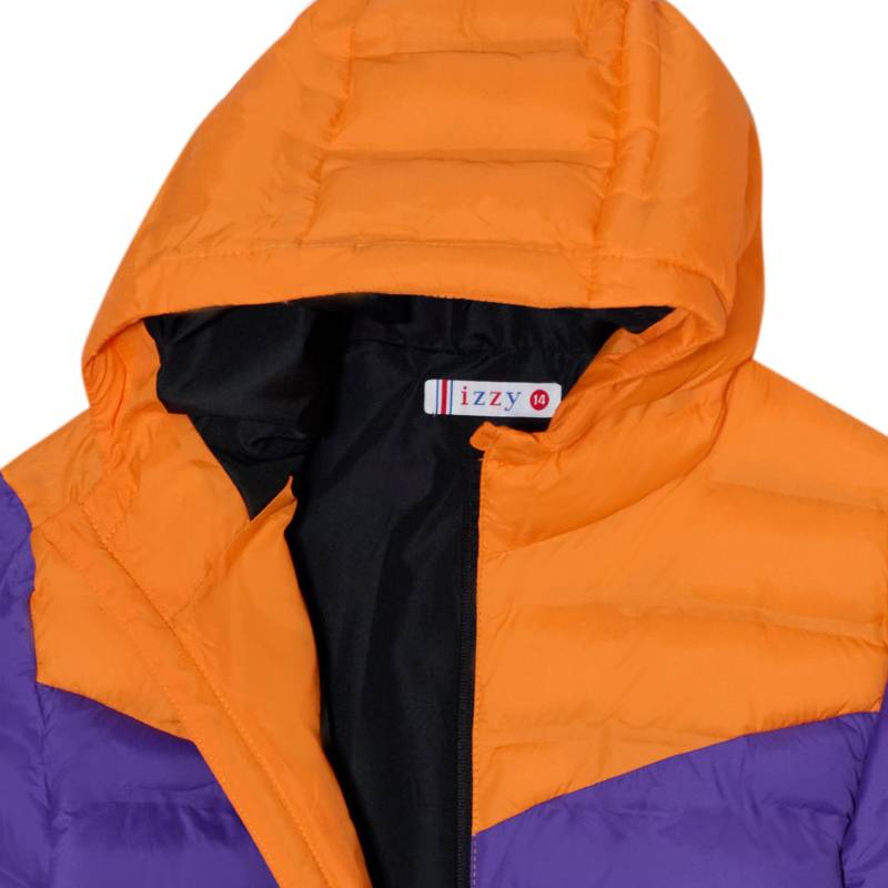 Campera de abrigo juvenil con capucha. Matelaseada con bastones combinada en dos colores donde predomina el color violeta combinado con naranja. Liviana con relleno de vellón siliconado. Bolsillos con cierre.