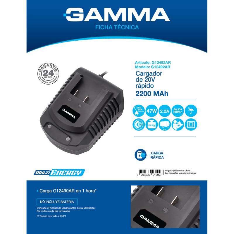 El cargador rápido 20V 2200mAh multienergy Gamma G12492AR es la solución ideal para mantener tus herramientas siempre listas. Este cargador rápido de 20V es compatible con ambas baterías de nuestra línea multienergy, garantizando una carga eficiente y rápida. Alimentado por 220 VCA 50hz, utiliza tecnología step-down inverter para ofrecer una potencia de 47W y una capacidad de carga de 2200mAh. La batería de litio de 2000mAh asegura una larga duración y rendimiento óptimo. Con un voltaje de 20V, este cargador es perfecto para cualquier tarea. Marca Gamma, modelo G12492AR, en condición nueva, es una herramienta indispensable para cualquier profesional