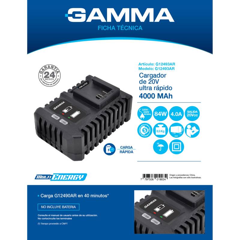 El cargador rápido 20V 4000mAh multienergy Gamma G12493AR es la solución ideal para mantener tus herramientas siempre listas. Este cargador rápido de 20V es compatible con ambas baterías de nuestra línea multienergy, garantizando una carga eficiente y rápida. Alimentado por 220 VCA 50hz, utiliza tecnología step-down inverter para ofrecer una potencia de 84W y una capacidad de carga de 4000mAh. La batería de litio de 2000mAh asegura una larga duración y rendimiento óptimo. con un voltaje de 20V, este cargador es perfecto para cualquier tarea. Marca Gamma, modelo G12493AR, en condición nueva, es una herramienta indispensable para cualquier profesional