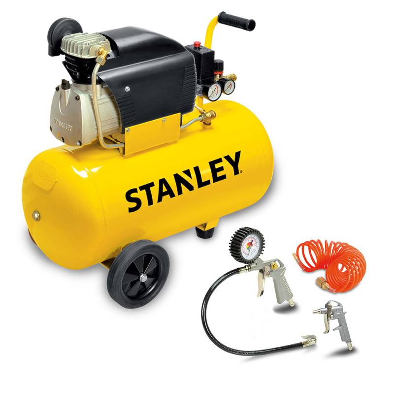 Compresor 50L Stanley + 4Pz KIT de 4 piezas: Pistola de pintar con deposito superior, pistola para inflar neumáticos con manómetro, Pistola de sopletear progresiva (progresiva es una pistola que permite regular el flujo en base a la posición del gatillo.) y manguera de alta presión 5 Mts.