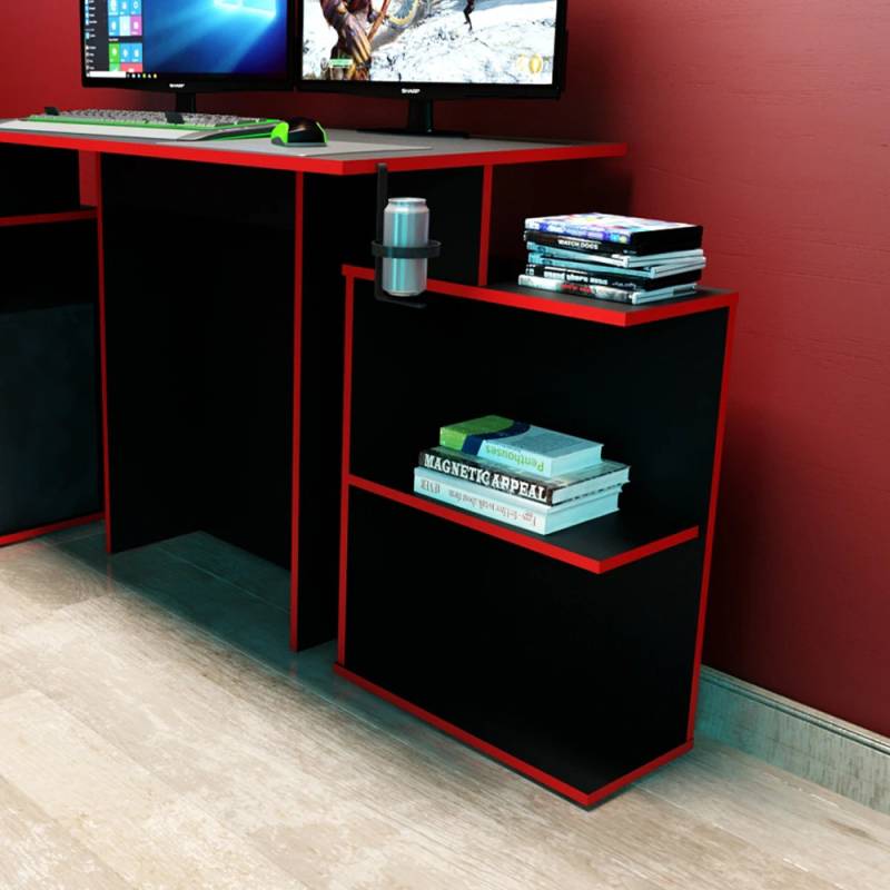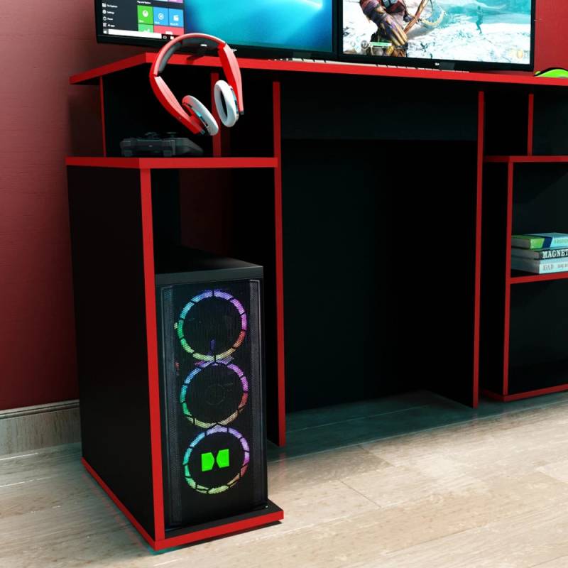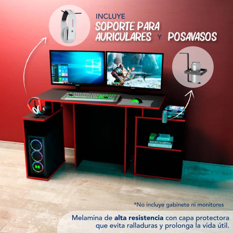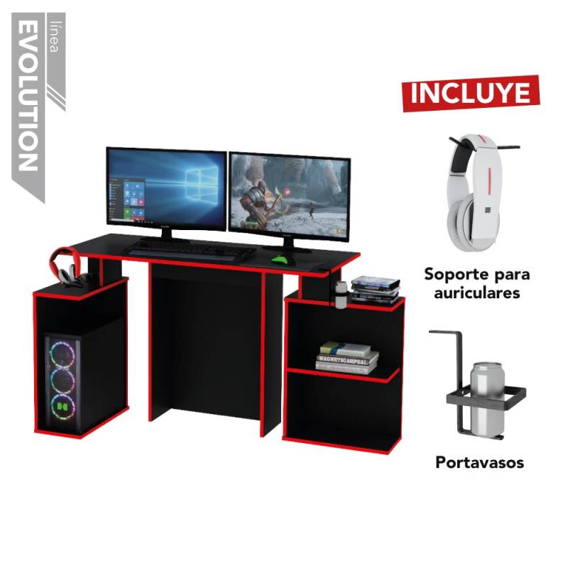 Escritorio pensado para el gamer de la familia. Tiene espacio para CPU y dos monitores. Incluye accesorio para auriculares y vaso o lota de bebida ¡un escritorio con mucha onda y neón!