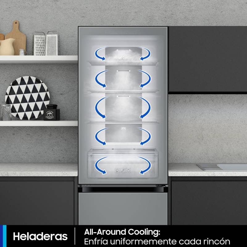 All around cooling: enfría cada compartimento de manera uniforme de una esquina a otra. Comprueba continuamente la temperatura y hace circular el aire frío a través de rejillas de ventilación estratégicamente situadas. Así, los alimentos se mantienen a la temperatura óptima y se conservan frescos durante más tiempo.
