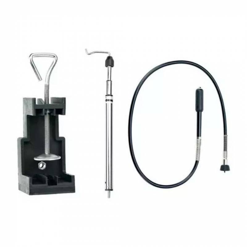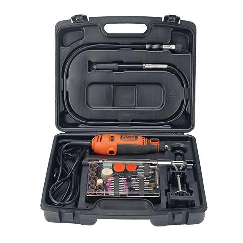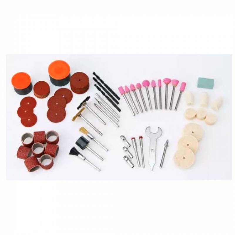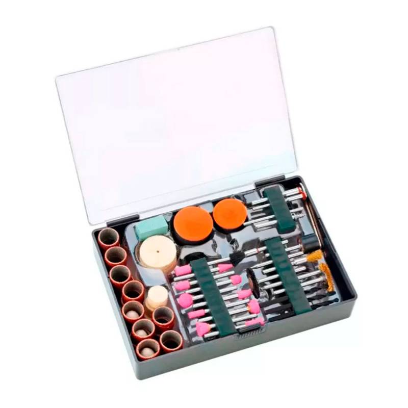(1) Prensa soporte, (1) Eje metálico ajustable para colgar, (1) Eje flexible, (1) Llave para collet, (3) Collets: 1/8, 3/32, 1/16, (23) Discos de corte, (31) Discos de lijado, (1) Tambor para lijado, (18) Cintas para lijado, (9) Discos de fieltro para pulir, (1) Cepillo de bronce, (1) Cepillo de bronce radial, (1) Cepillo de cerdas, (1) Cepillo de cerdas radial, (3) Mechas diamantadas, (3) Brocas multiuso, (2) Mandriles de tornillo, (1) Mandril para ruedas de fieltro, (1) Piedra de rectificado, (10) Piedras de amolar y caja plástica.