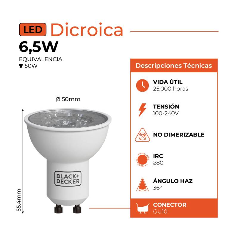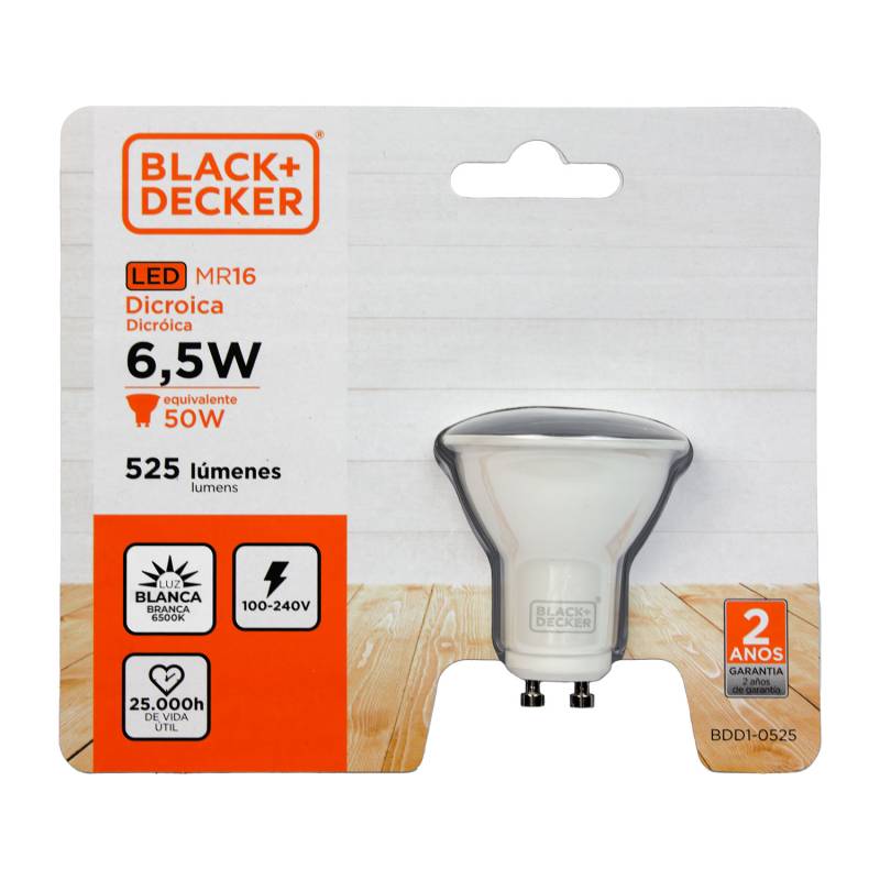 La lámpara led Black+Decker 6.5W MR16 Dicroica es ideal para quienes buscan una luz potente y focalizada en espacios como salas de exhibición, restaurantes o vitrinas. Su diseño con rosca MR16 permite una iluminación dirigida, perfecta para resaltar áreas específicas de tus ambientes. Con tecnología led, ofrece un ahorro energético de hasta un 85% en comparación con las bombillas tradicionales, y su vida útil de hasta 25,000 horas garantiza un rendimiento duradero.