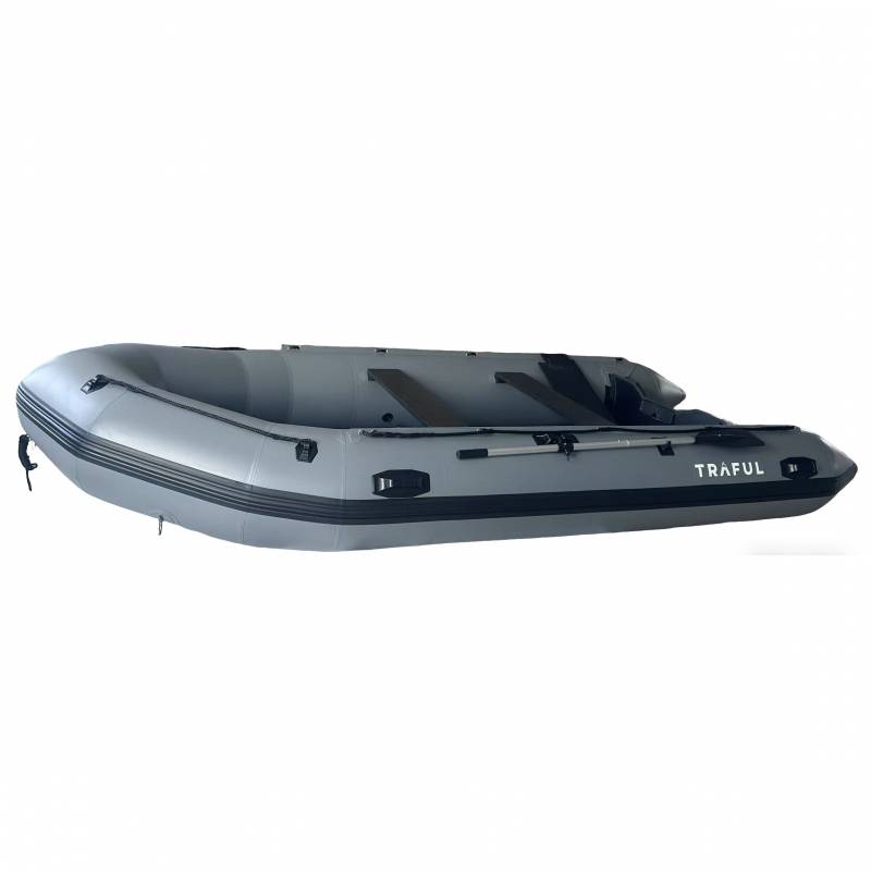 Esta lancha inflable gris TRAFUL es súper versátil: perfecta para relajarte en el agua o para usarla de forma práctica. Está construida de forma robusta (costuras reforzadas, anillas D resistentes para sujetar equipo) y es segura (diseño multicompartimento para mayor tranquilidad).