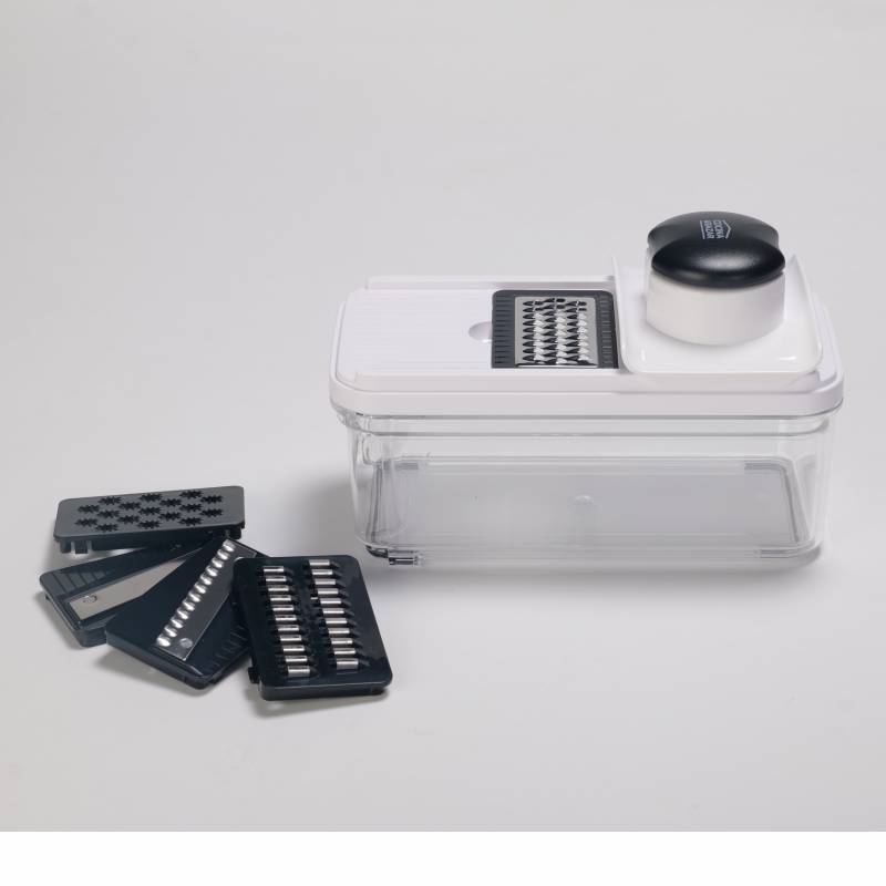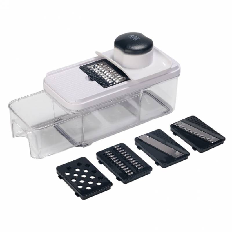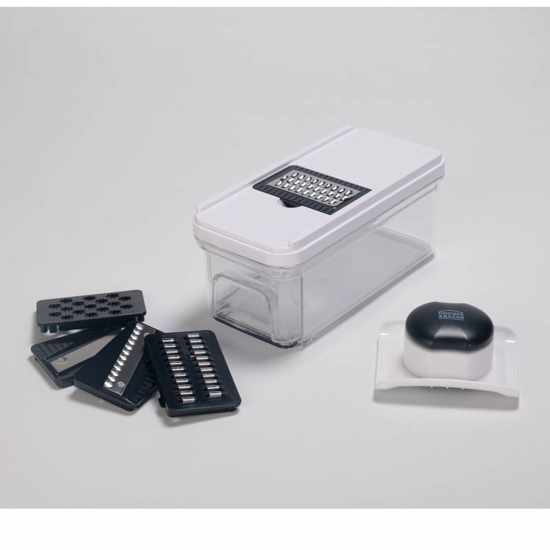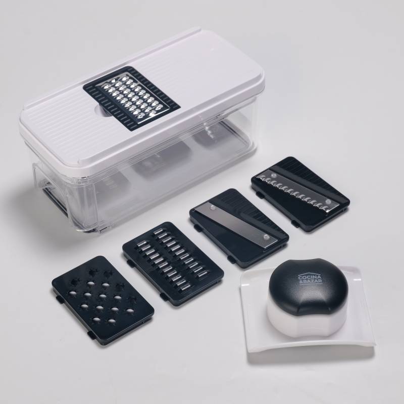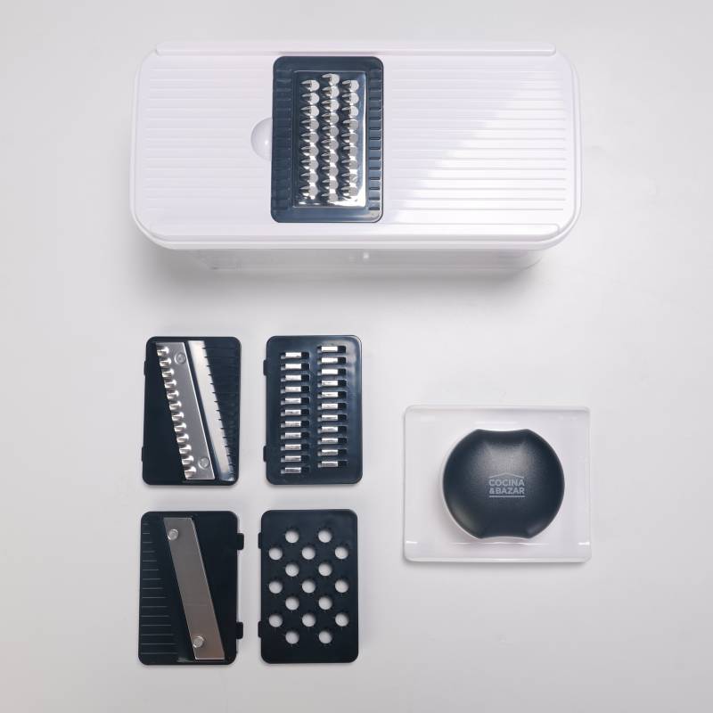 Cortador Mandolina b870-c Incluye 5 cuchillas intercambiables que permiten realizar distintos tipos de corte y rallado: rebanador de 2 mm, rallador grueso, rallador fino, cuchilla ondulada y rallador. cuenta con un portaherramientas de seguridad de fácil desmontaje y un contenedor de 900 ml que mantiene los alimentos en su interior para un uso ordenado. Sus patas antideslizantes ofrecen mayor seguridad y estabilidad durante la operación, y todos sus componentes son aptos para lavavajillas.