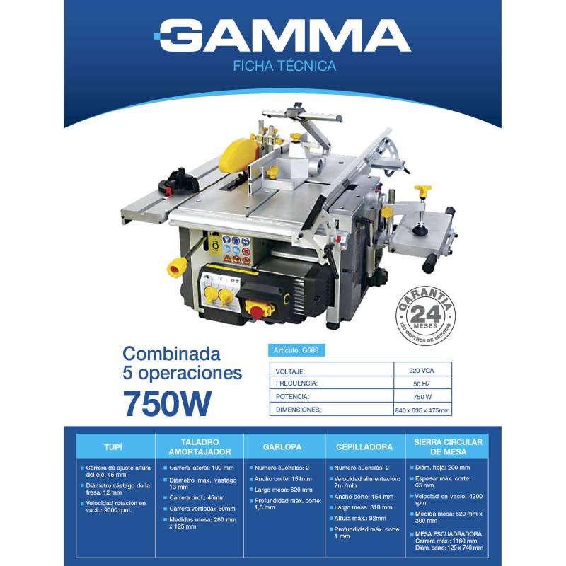 Esta máquina multifunción Gamma, combina en un solo cuerpo una sierra circular de mesa, un taladro amortajador, una garlopa/cepilladora, un tupí y además de una mesa lateral para escuadrar. Asimismo, dispone de toberas colectoras de polvo con conexiones para usar una aspiradora auxiliar que permite trabajar con comodidad y limpieza.