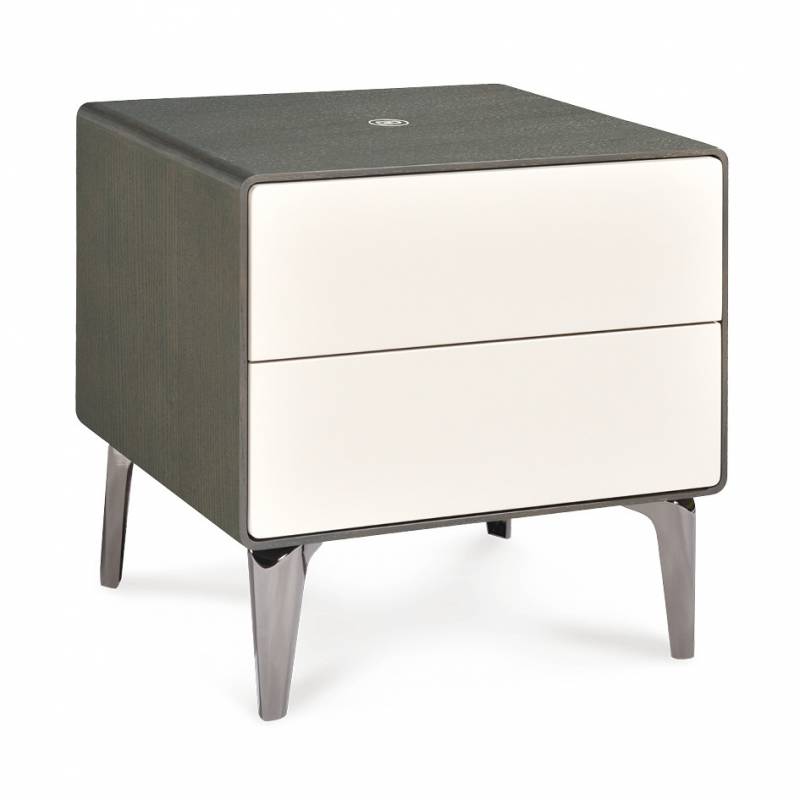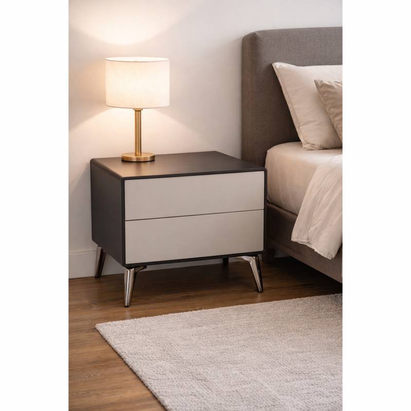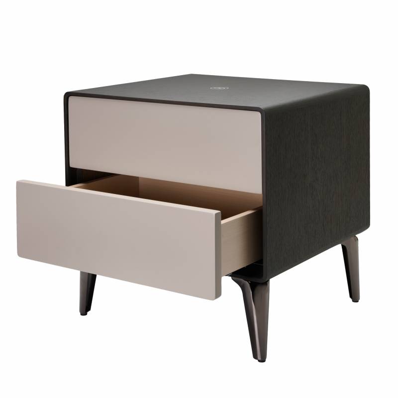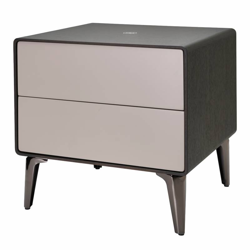 Color roble gris y beige. Diseño moderno que cuenta con 2 cajones y cargador inalámbrico integrado. Incluye además luz automática. Perfecta para darle un estilo moderno y tecnológico a tu dormitorio.