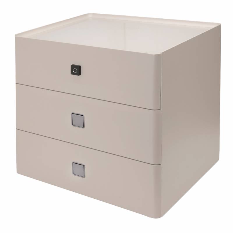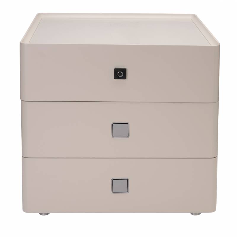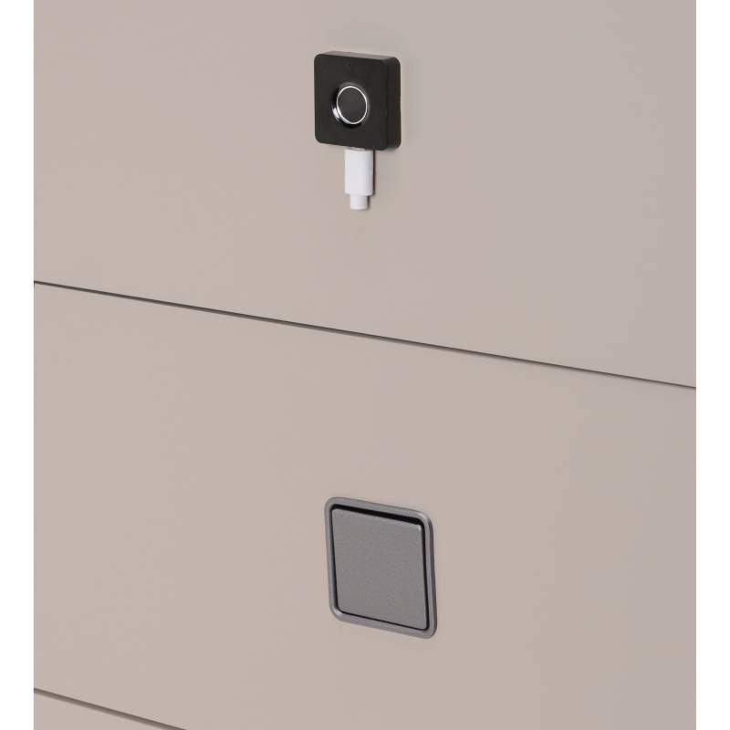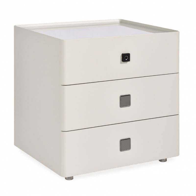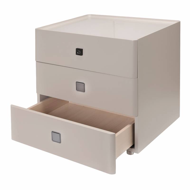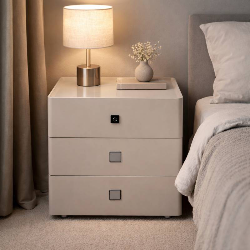 Color beige. Diseñada para ofrecer confort y tecnología, incluye un primer cajón con cerradura de huella digital para guardar tus objetos de forma segura. Con luz automática y cargador inalámbrico, permite cargar tu celular con solo apoyarlo. Una opción moderna, práctica y elegante para elevar tu espacio.