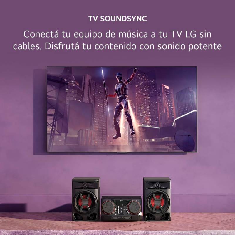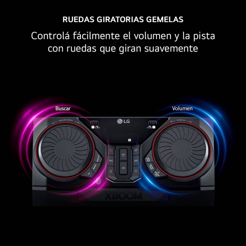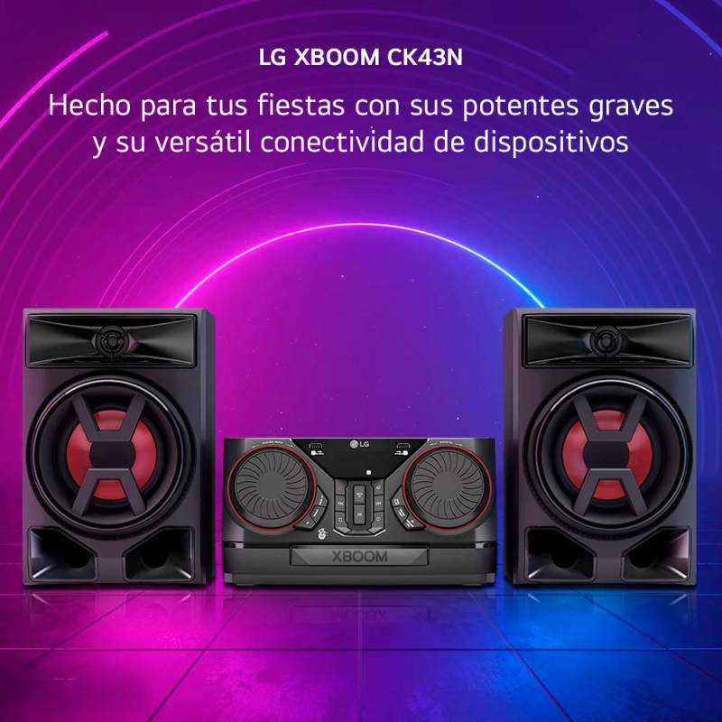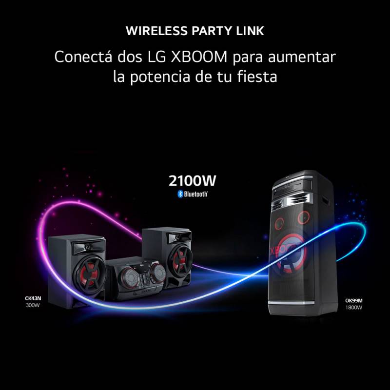 [300 w] XBOOM CK43N ofrece un sonido potente con 300 w de potencia, ideal para llevar la música a otro nivel. Su alto rendimiento garantiza bajos profundos y agudos claros, brindando una experiencia de audio envolvente. [Multi Bluetooth] La función Multi Bluetooth permite conectar varios dispositivos al mismo tiempo, facilitando el control de la música sin interrupciones. Con esta tecnología, diferentes usuarios pueden turnarse para reproducir sus canciones favoritas sin necesidad de desconectar y volver a emparejar los dispositivos. [Wireless Party Link] La función Wireless Party Link permite conectar dos equipos de sonido LG de forma inalámbrica para duplicar la potencia y disfrutar de un audio más envolvente. Con esta tecnología, es posible ampliar la experiencia sonora en fiestas y reuniones sin necesidad de cables adicionales, asegurando un sonido potente y sincronizado. [TV Sound Sync] La función TV Sound Sync del LG CK43 permite conectar el equipo de sonido de forma inalámbrica con un televisor LG compatible, sincronizando el audio sin necesidad de cables. Esto ofrece una experiencia más inmersiva y un sonido potente para disfrutar de tus programas, películas y música con mayor calidad. [App XBOOM] La APP XBOOM permite controlar de forma remota y personalizada la experiencia sonora del equipo. Con su interfaz intuitiva, podes ajustar el volumen, elegir modos de sonido y configurar diversas opciones para optimizar la calidad del audio según tus preferencias.