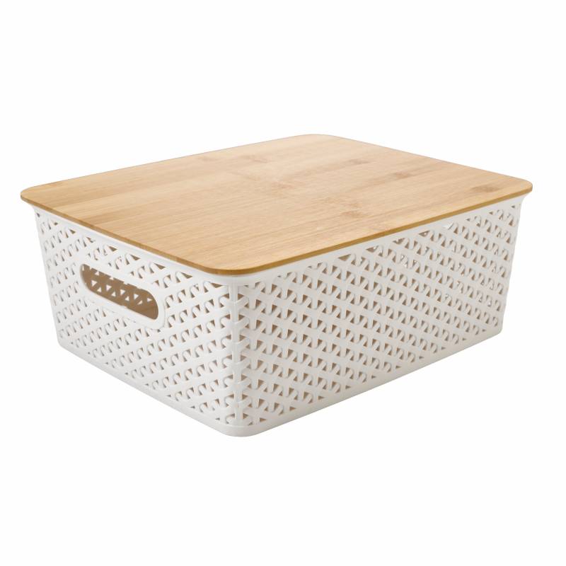 Organizador de 12 l con tapa de bambu, práctico y estético. Perfecto para guardar accesorios del hogar. Su diseño blanco y natural aporta orden y estilo en cualquier espacio.