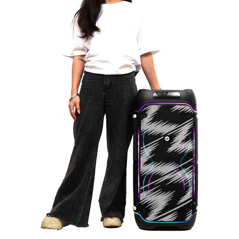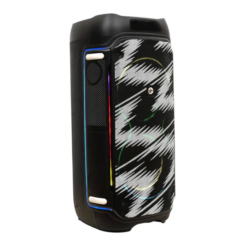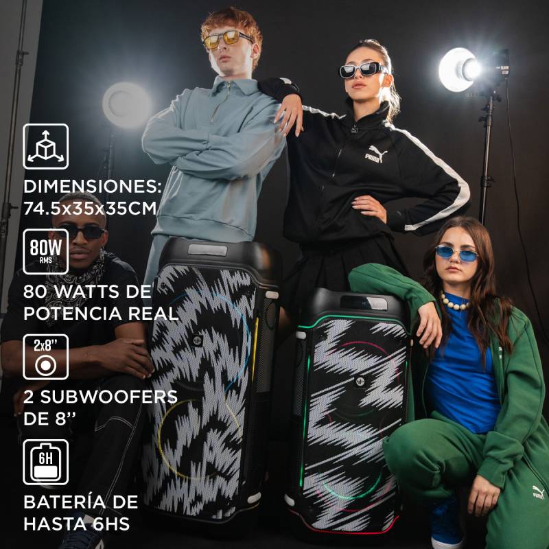 Parlante BT 80W RMS con luces audiorrítmicas Potencia, sonido claro y ambiente de fiesta en un solo equipo. Con 2 woofers de 8? + tweeter de 3?, entrega un audio balanceado con graves intensos y agudos definidos, alcanzando 80W RMS reales.