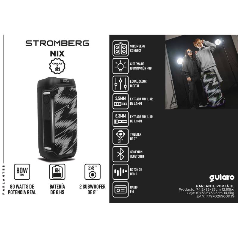 Compatible con Stromberg Connect, ofrece diversas opciones de conexión: Bluetooth, AUX 3,5 mm y 6,3 mm, además de radio FM integrada para mayor versatilidad.