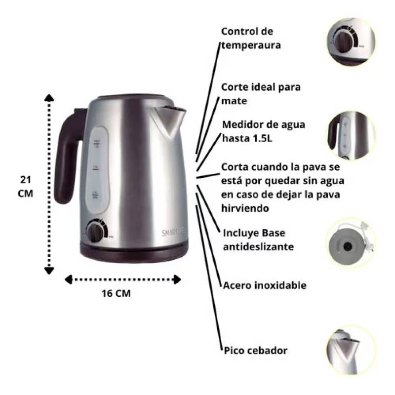 ¡Tené el agua caliente siempre lista! Con la pava eléctrica Smartlife SL-EK1510IX vas a poder disfrutar de una bebida caliente en minutos. Ganá tiempo y prepará ese mate, cafecito o porqué no, esa sopa instantánea que tanto te gusta.