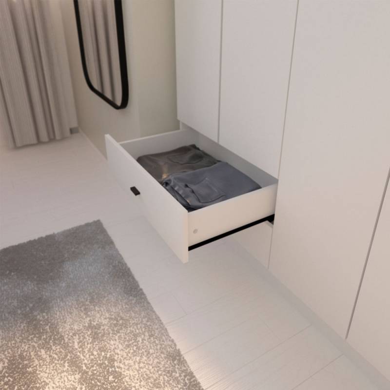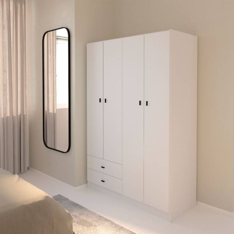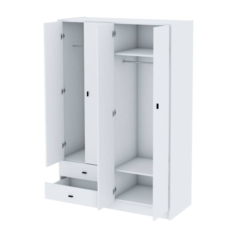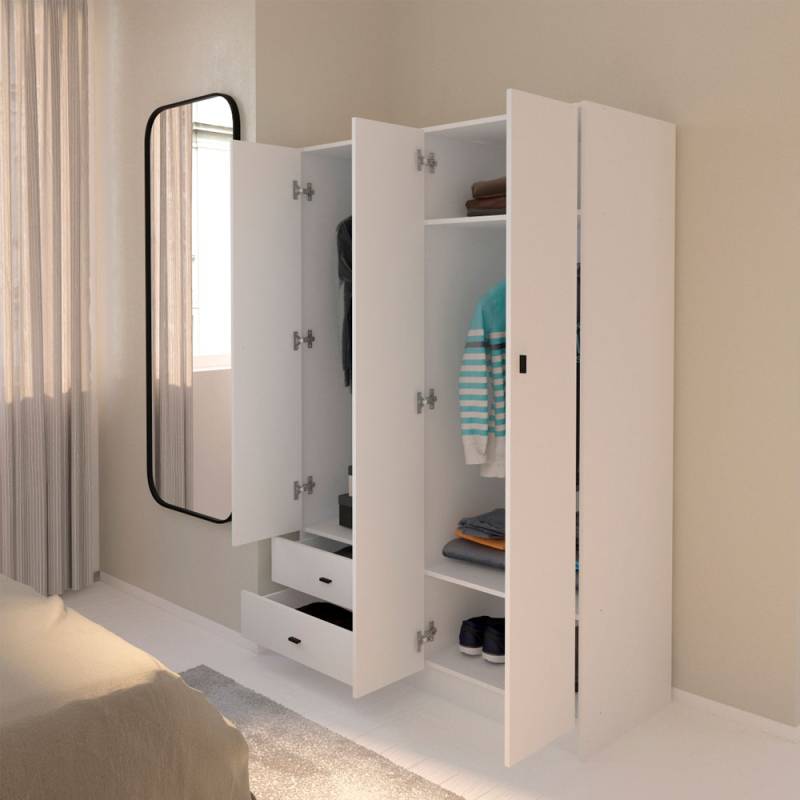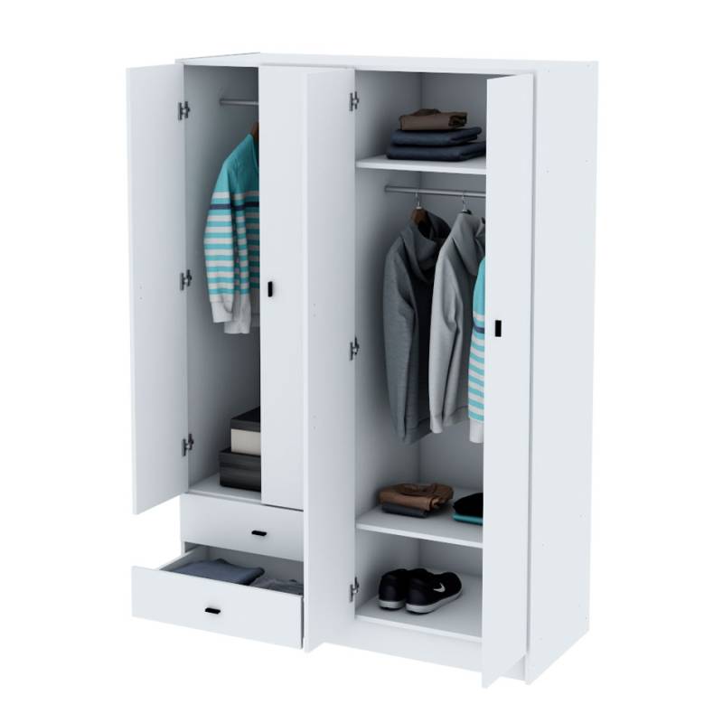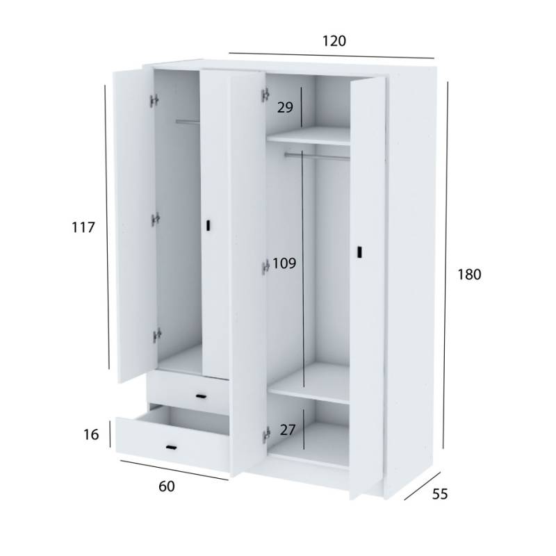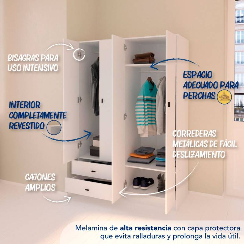 Ropero de línea clásica de 180 cm de alto, 120 cm de ancho y 55 cm de profundidad. En su interior dos espacios independientes de colgado, en la parte inferior dos cajones y un espacio para zapatos y, en su espacio superior, un estante. Un ropero de buen tamaño ideal para compartir.