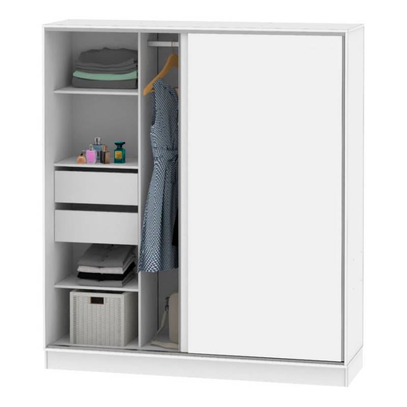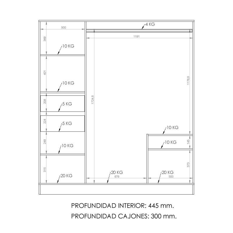 El producto cuenta con 2 cajones internos, estantes para guardado y barral para colgar ropa y accesorios. Podes encontrarlo en blanco, wengue o roble bordolino.