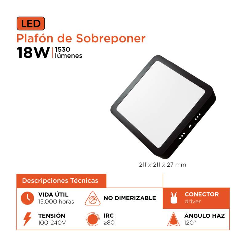 Este plafón led de sobreponer cuadrado 18W Black+Decker en tono negro ofrece una luz clara y de excelente cobertura, ideal para salas, dormitorios o estudios. Su diseño sobrio y elegante se adapta a cualquier techo, aportando una estética moderna con instalación sencilla. La tecnología led asegura un bajo consumo y encendido inmediato.