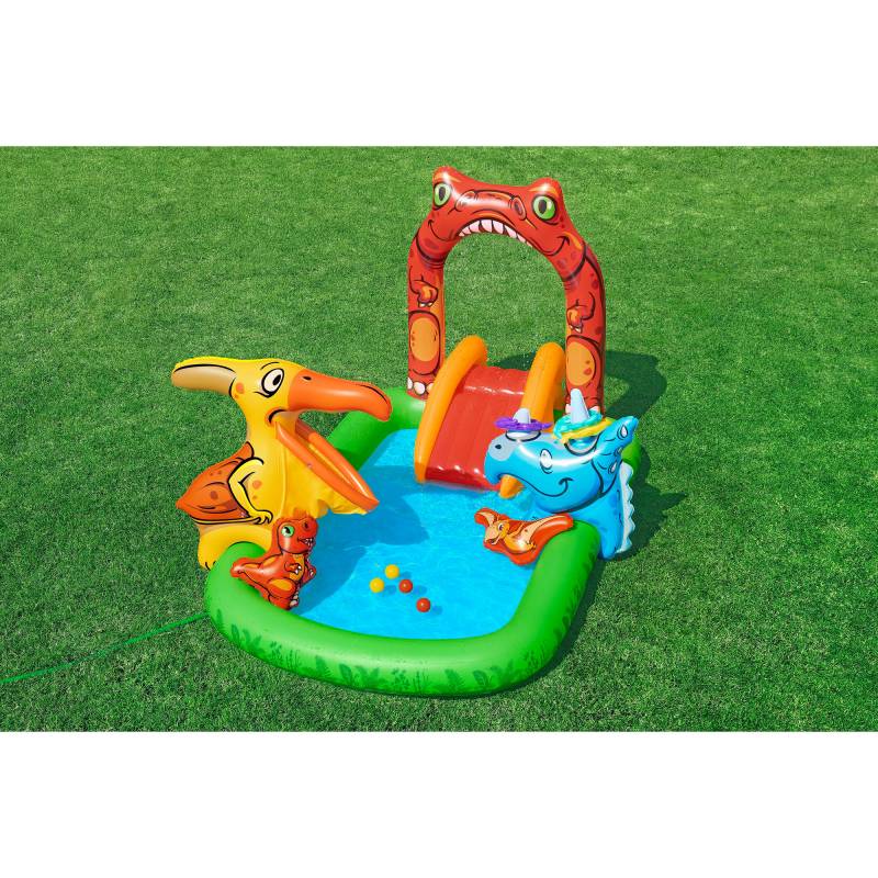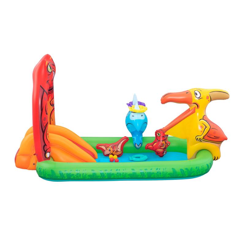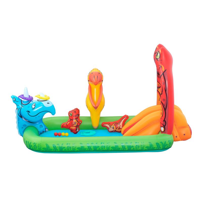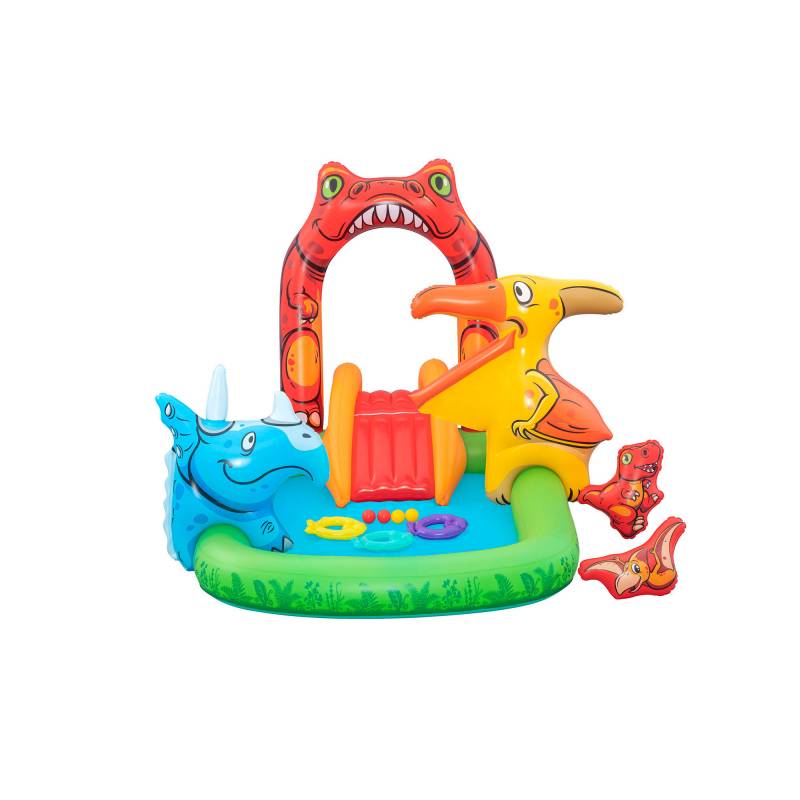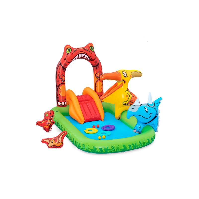 ¡Haz que este verano sea inolvidable con el Centro de Juegos Jurassic Splash™ de Bestway®! A tus hijos les encantará chapotear y deslizarse bajo la cascada del arco del T-Rex hasta la laguna llena de dinosaurios que hay debajo. O pueden apuntar a la boca abierta del Pteranodon para jugar a lanzar la pelota con las 4 pelotas incluidas. Los niños también pueden lanzar los 3 anillos con forma de pez al Triceratops para ver cuántos pueden enganchar en su cuerno. Y si eso les resulta demasiado fácil, el dinosaurio hinchable puede moverse por el centro de juegos para aumentar la dificultad. Este centro de juegos también puede utilizarse en interiores sin agua en días fríos o nublados. Así que, tanto si lo montas en el jardín como en el interior cuando hace frío, ¡tus hijos disfrutarán de horas de diversión DINO-mita con el centro de juegos Jurassic Splash de Bestway!