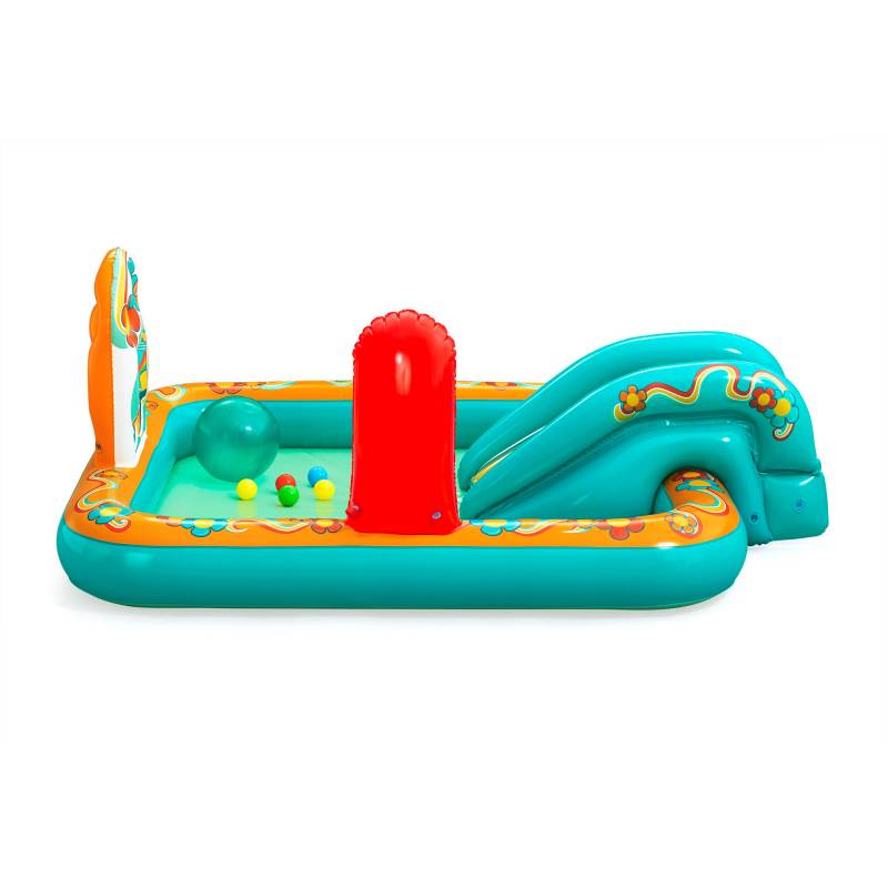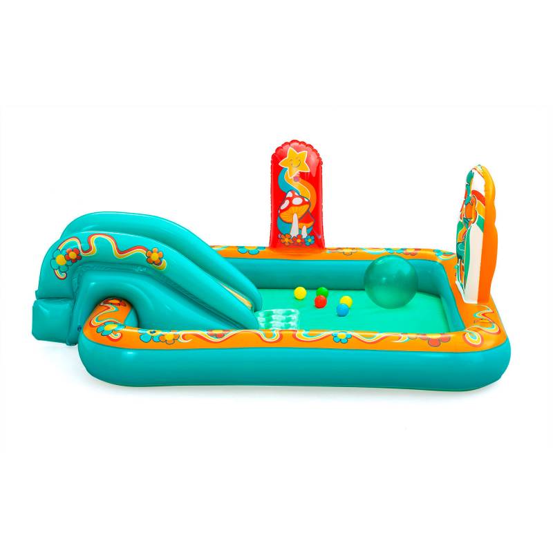 ¡Que empiece el buen rollo en el centro de juegos Retro Groove™ de Bestway®! Los mayores de 2 años se lo pasarán en grande jugando con la pelota de playa inspirada en la música disco de este centro de juegos de temática retro. En los calurosos días de verano, los niños podrán refrescarse con el aspersor de agua que se conecta a una manguera de jardín. Disfrutarán bajando por el divertido tobogán que está soldado al fondo de la piscina para mayor seguridad. La pared de clasificación de bolas les permitirá divertirse mientras trabajan su psicomotricidad colocando las 5 bolas en los agujeros de la pared. El centro de juegos también tiene una válvula de drenaje fácil de usar para descargar el agua de la piscina, por lo que el desmontaje se hace en un plis y el almacenamiento es muy sencillo. Los niños pueden incluso jugar en el centro de juegos sin agua para disfrutarlo durante todo el año. Prepárate para viajar en el tiempo mientras chapoteas con los más pequeños en el centro de juegos Retro Groove de Bestway.
