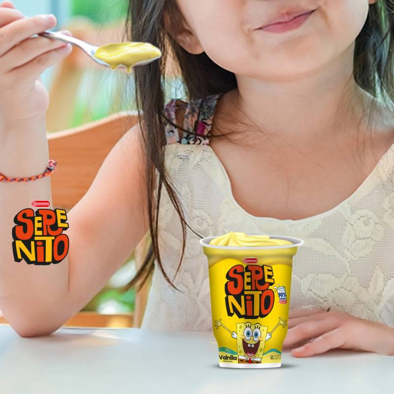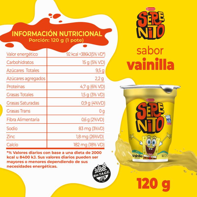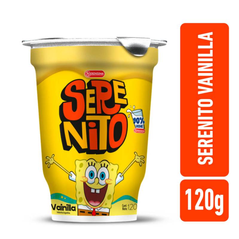 SERENITO Minions, cremoso, vainilla. Serenito Vainilla el preferido de los chicos y de los padres, porque está elaborado con un 90% de leche fresca La Serenísima y es libre de sellos. Cuchareá a todo ritmo con la nueva receta. COPA 120gr.Postre sabor a vainilla fortificado con zinc libre de gluten. Sin TACC.
