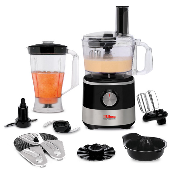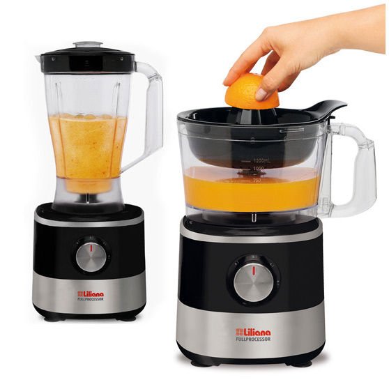 Vaso procesador de 1.2Lts. Cuchillas intercambiables para juliana, rebanar y rallar. Con accesorio batidor que gira dentro del vaso y sobre su eje. Vaso licuador de 1.7 Lts Acesorio expimidor de cítricos.