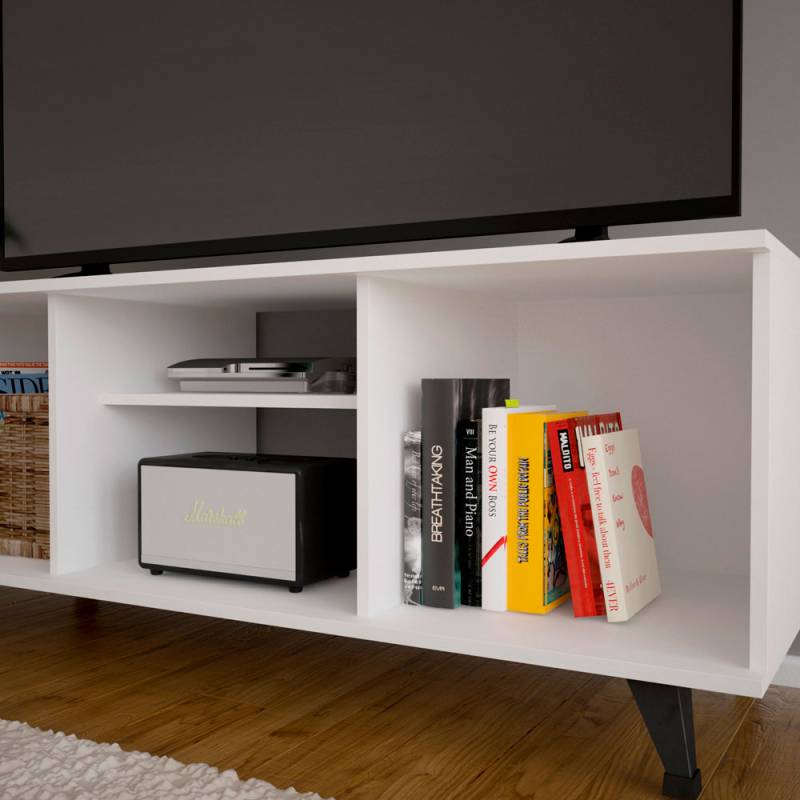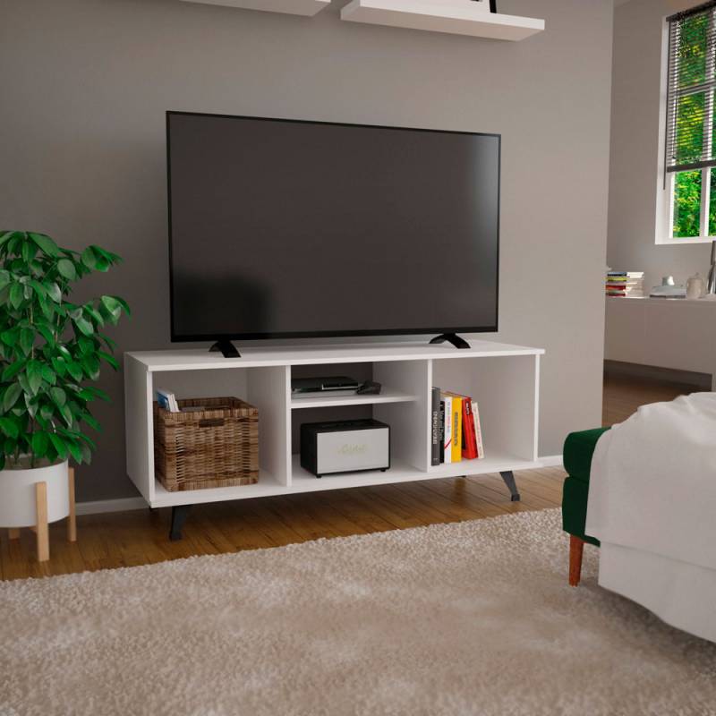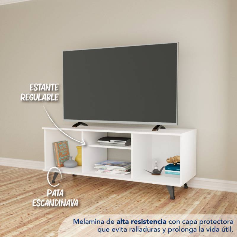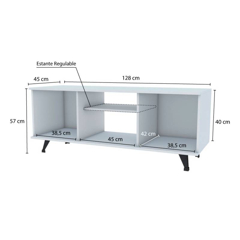 De líneas sencillas, este mueble de tv combina con todo tipo de ambiente. Cuenta con tres compartimientos y un estante regulable para ajustar a tus necesidades. Ideal para tener organizados tus dispositivos multimedia. Medidas aptas para TV 55.