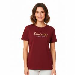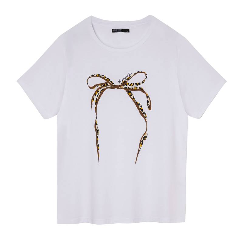 Remera de mujer de corte clásico y fit relajado. Presenta cuello redondo, mangas cortas y un estampado frontal con diseño de moño y detalle de texto. Confeccionada en tejido suave y liviano, ideal para looks casuales con un toque distintivo.
