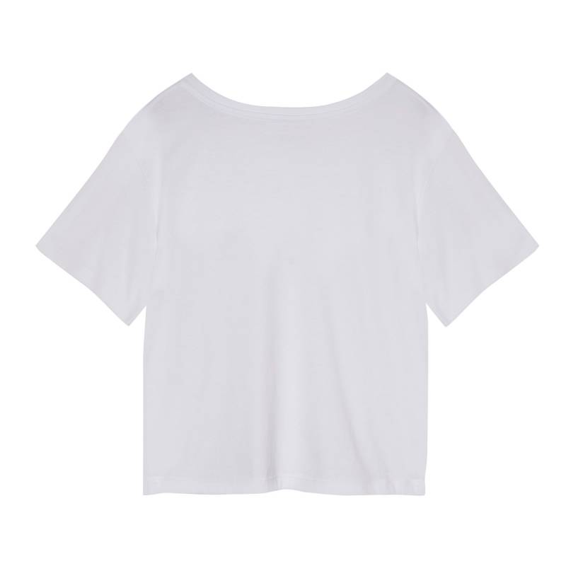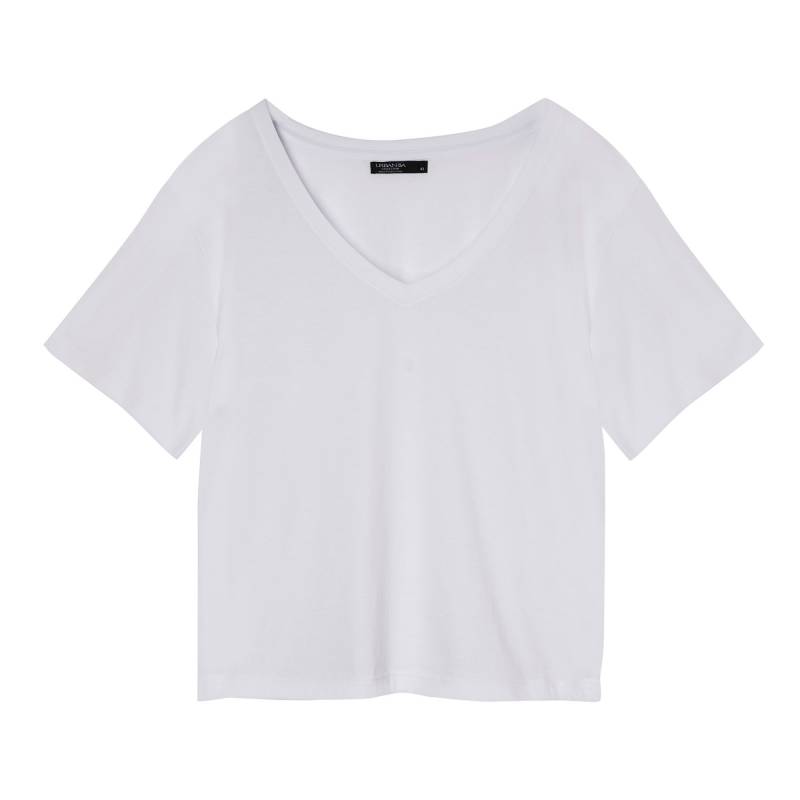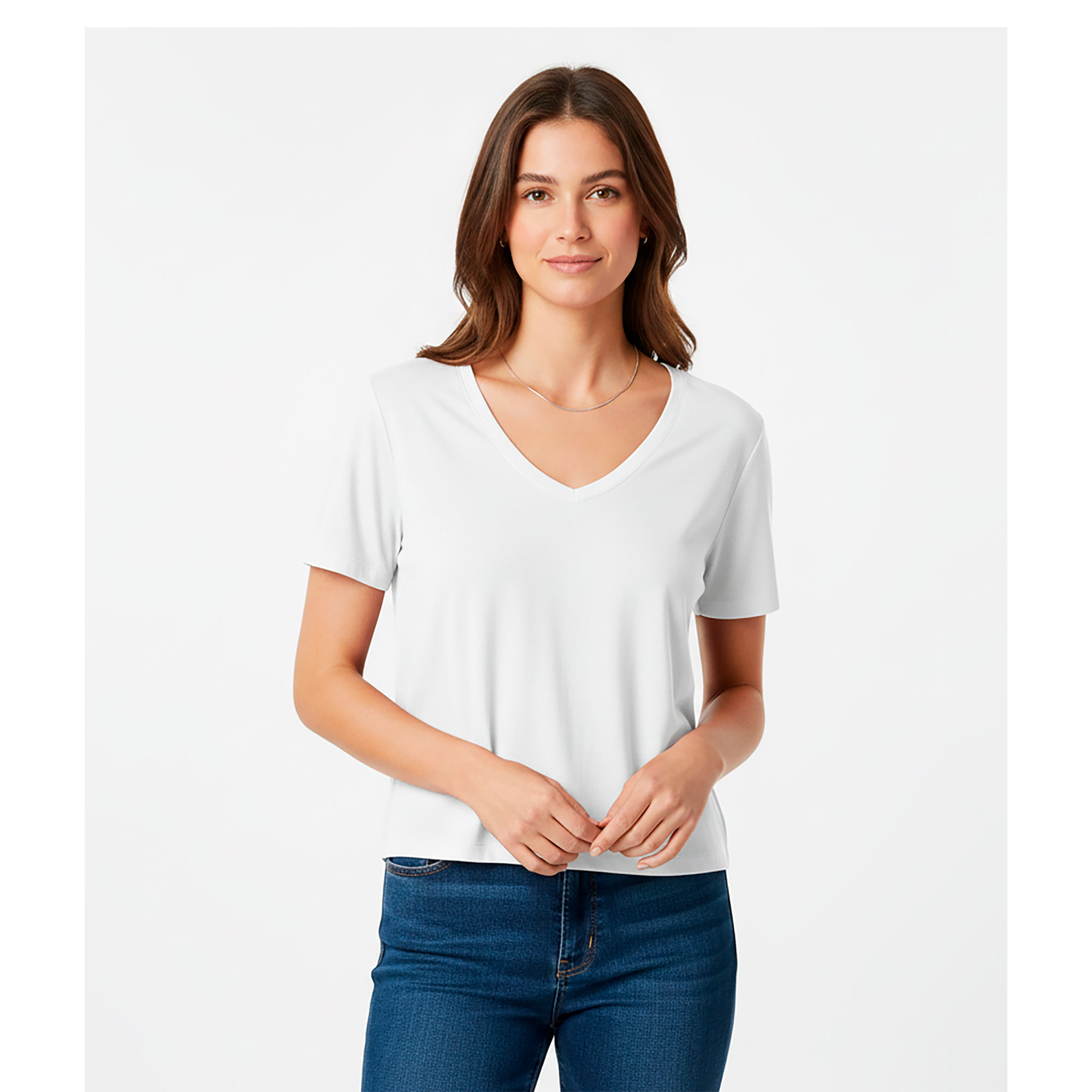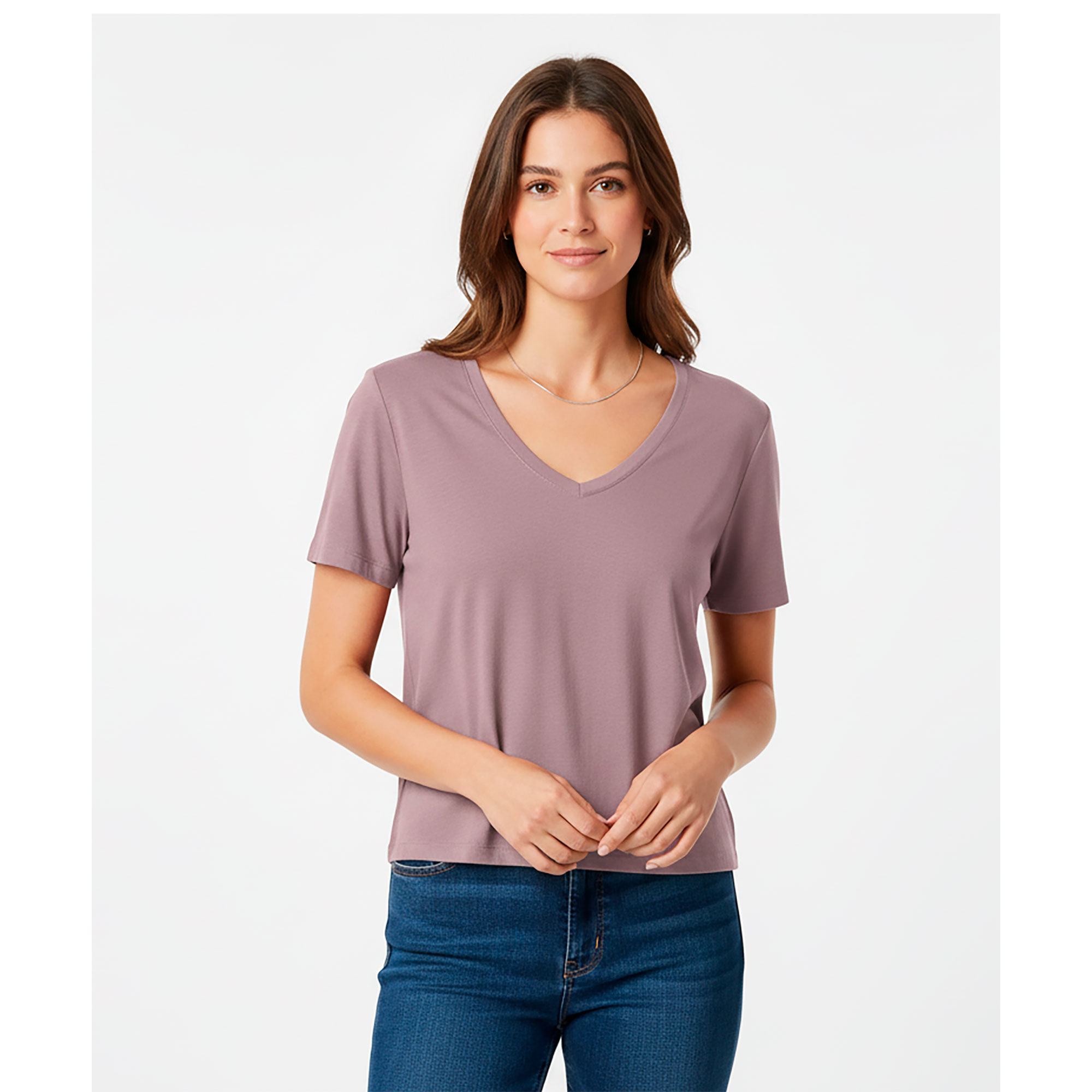 Remera de mujer con escote en “V” y silueta amplia. Confeccionada en tejido suave y liviano, ofrece una caída natural y un calce cómodo. Su diseño básico y versátil la convierte en una prenda esencial para el uso diario.