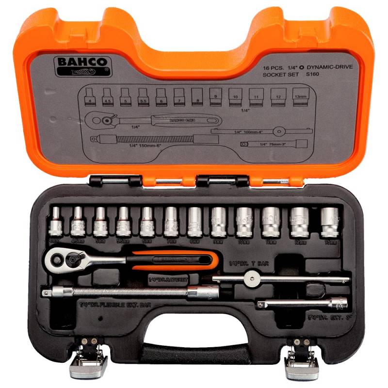 12 piezas, bocallaves hexagonales de 1/4", 4, 4.5, 5, 5.5, 6, 7, 8, 9, 10, 11, 12 y 13 mm. Un crique de 1/4" de liberación rápida, 60 dientes/ángulo de acción de 6°. Una barra en T deslizante de 1/4", 100 mm/4". Una barra de extensión 1/4", 75 mm/3". Una barra de extensión flexible 1/4", 150 mm/6". Dos cajas de plástico con tres secciones desmontables y tapa. Acabado mate. Aleación de acero de alto rendimiento. Menos desgaste y daños del tornillo gracias a bocallaves con perfil Dynamic-Drive. Botón para extracción rápida del bocallave en el crique. Caja: Polietileno de alta densidad (HDPE). Normas: ISO 1174 y DIN 3120