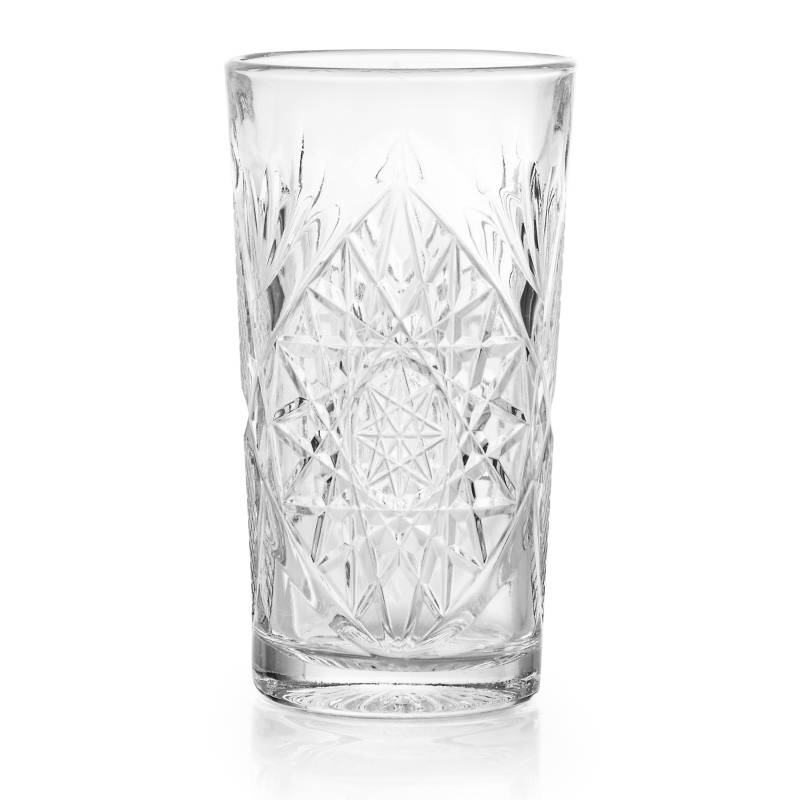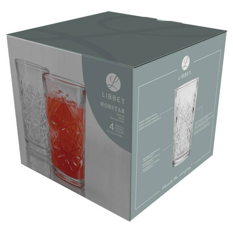Set de 4 vasos trago largo Hobstar con una capacidad de 470 ml (medidas: H 15,63cm ø 8,42cm) c/u. La línea Hobstar se caracteriza por el tramado de sus paredes y la robustez de sus piezas.