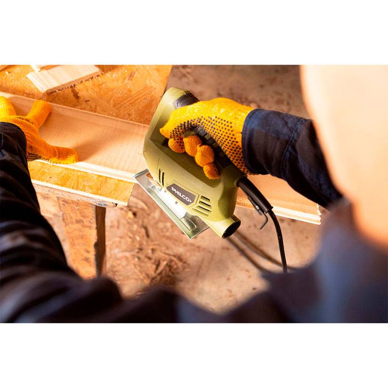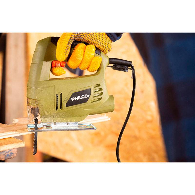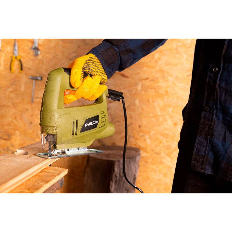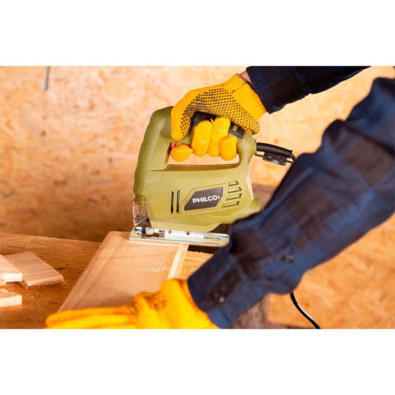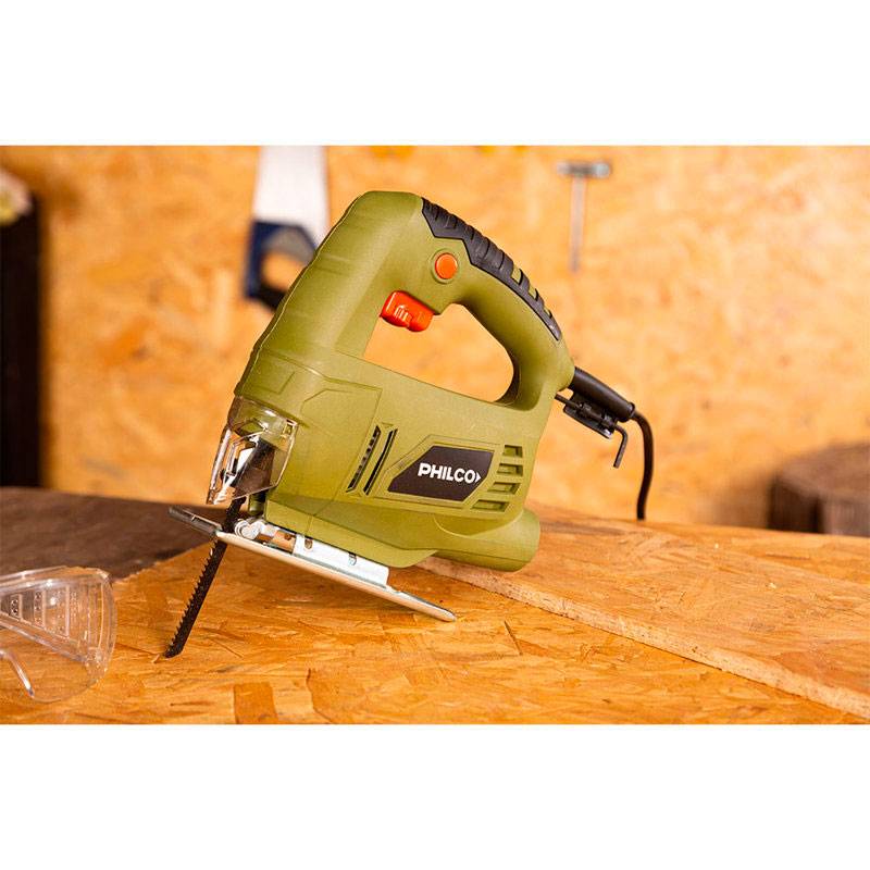 Sierra Caladora 350W. Velocidad: 0-3000 rpm (variable). Capacidad de corte: madera 60mm, aluminio 10mm y acero 5mm. Lock on switch. Accesorios: hoja de sierra para madera y llave allen.